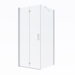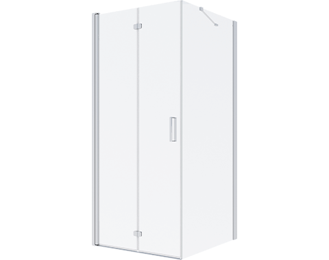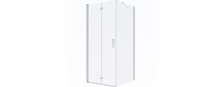 Quadratische Duschkabine mit scharnierten Falttüren. Dank der praktischen Lösung, die Tür auch nach innen zu öffnen, ist die Duschwand ideal für kleinere Bäder, in denen wir nach platzsparenden Produkten suchen.