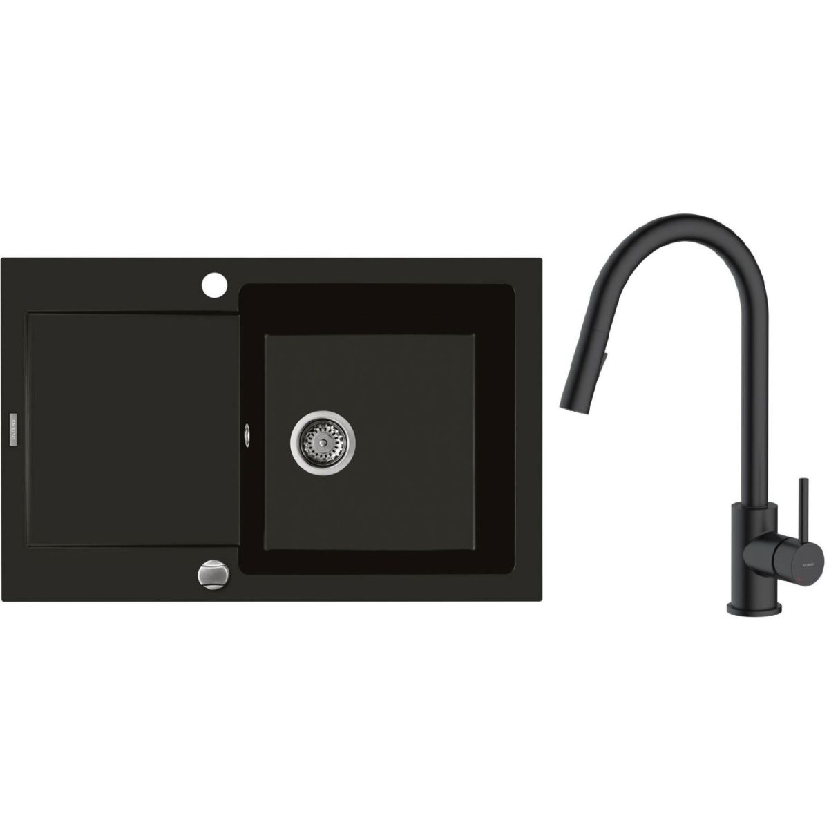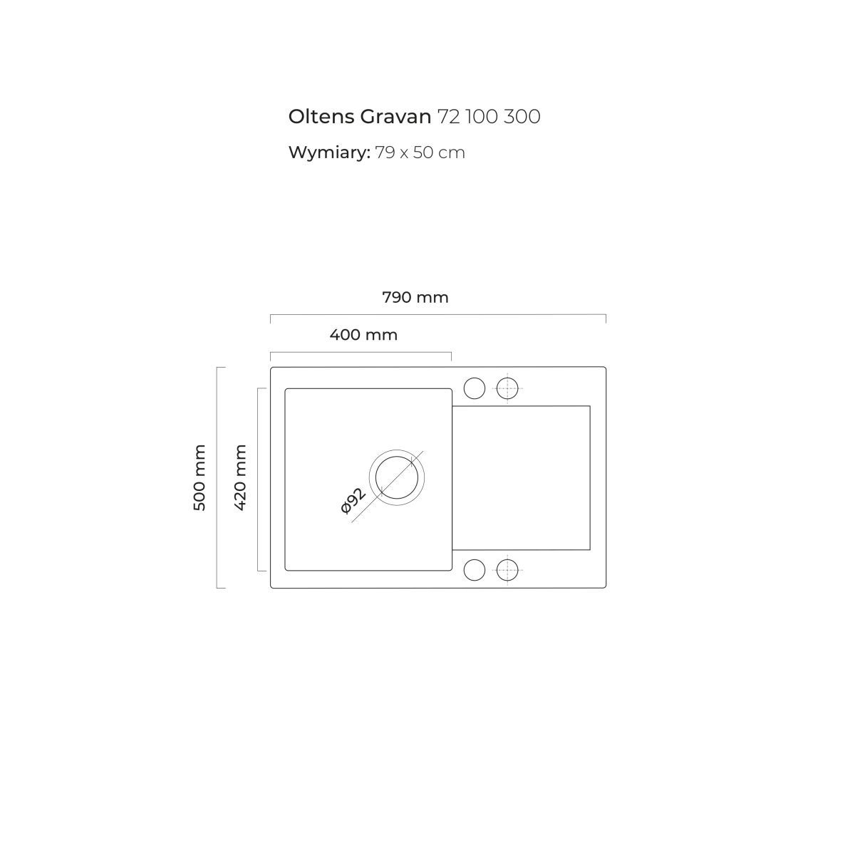 1. Oltens Gravan Granitspüle mit 1 Becken und kurzem Abtropffläche 79x50 cm schwarz matt 72100300