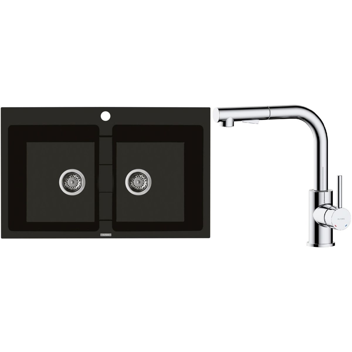 1. Oltens Gravan Granitspüle mit 2 Becken, 78 x 50 cm, schwarz matt, 72400300