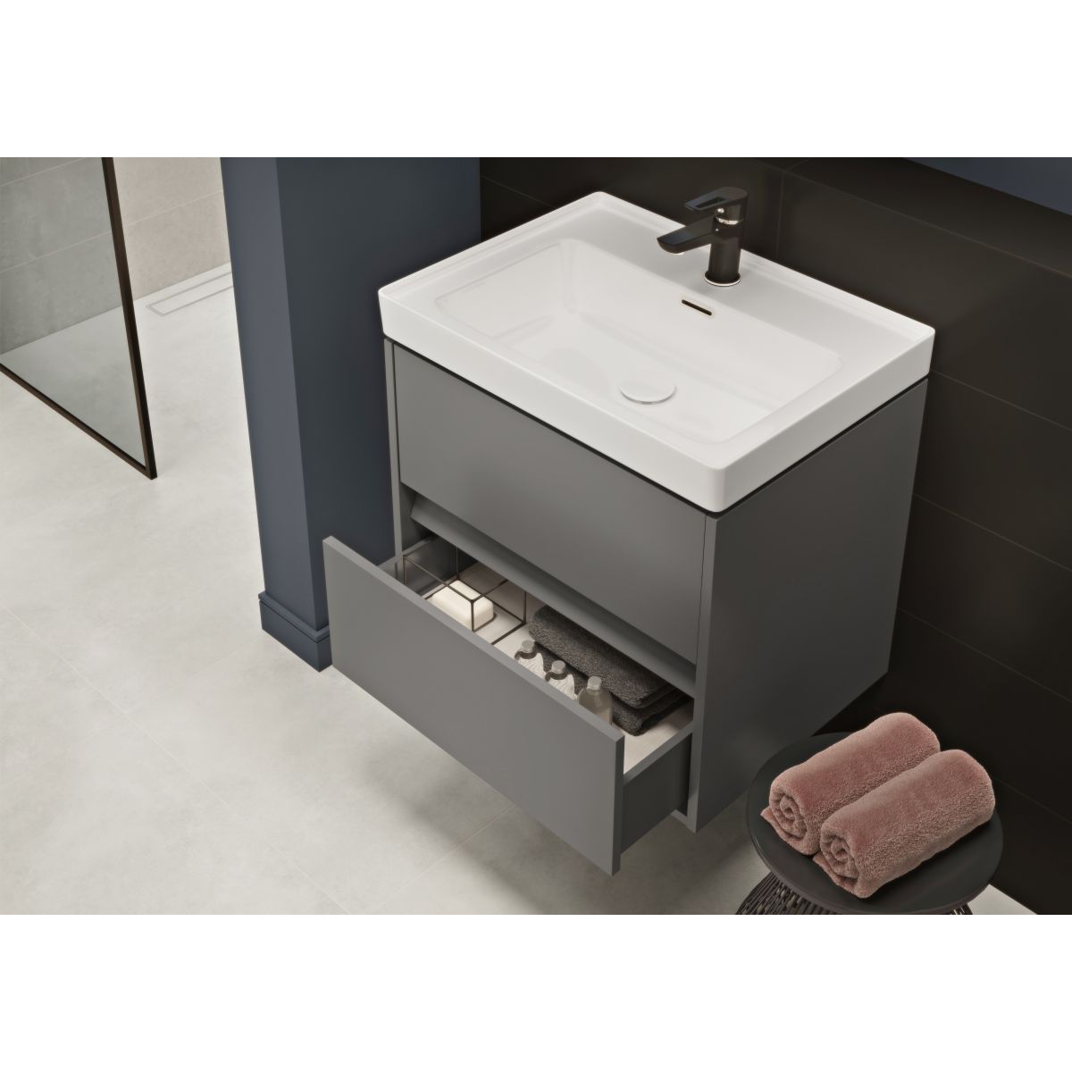 Das Set besteht aus einem hängenden Waschtischunterschrank CREA 60 mit einem Waschbecken CREA 60. Die Front und der Korpus des Schranks sind aus feuchtigkeitsbeständiger Spanplatte in mattem Grau gefertigt. Der Schrank ist mit einem Touch-Öffnungssystem (sog. PUSH SYSTEM) und zwei geräumigen Schubladen ausgestattet. Das Innere mit einer grauen Leinenstruktur verleiht dem Schrank ein besonders elegantes Aussehen. Das Waschbecken CREA ist aus ROCKLITE-Keramik gefertigt, wodurch es erstaunlich widerstandsfähig, leicht und mit extrem dünnen Wänden ist.