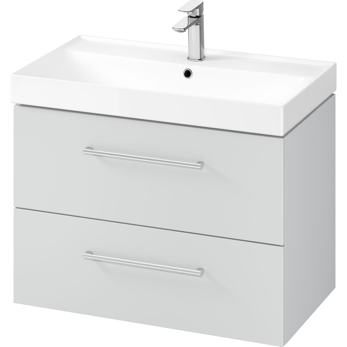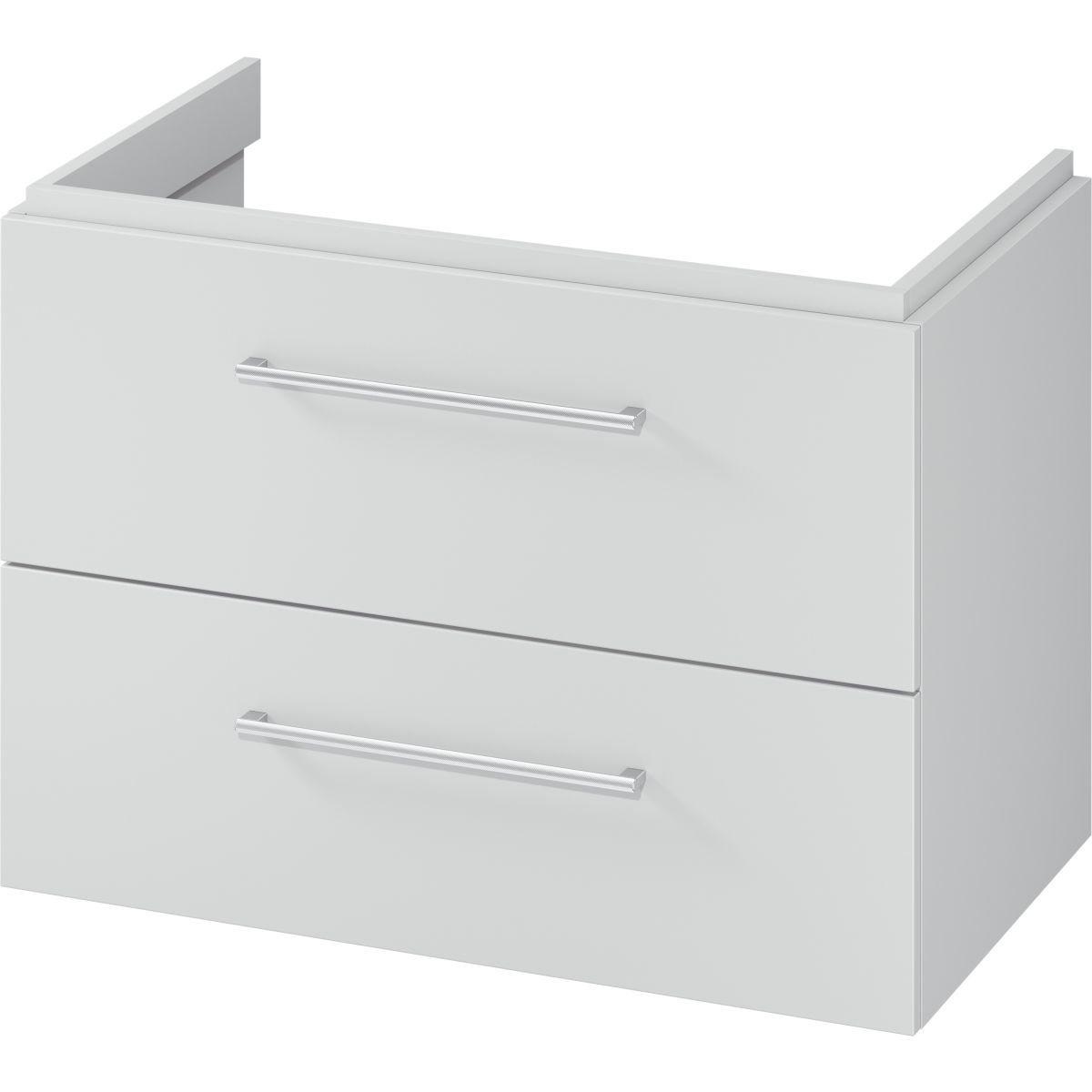 Laminierte Front und Korpus aus Spanplatte. Zwei geräumige Schubladen, leiser Soft-Close-Verschluss, graues Schubladeninnere. Die Spanplatte, aus der der Schrank gefertigt ist, verfügt über das Zertifikat FSC MIX 70 % SGSCH-COC-007574. Schrank in grauer Farbe.
