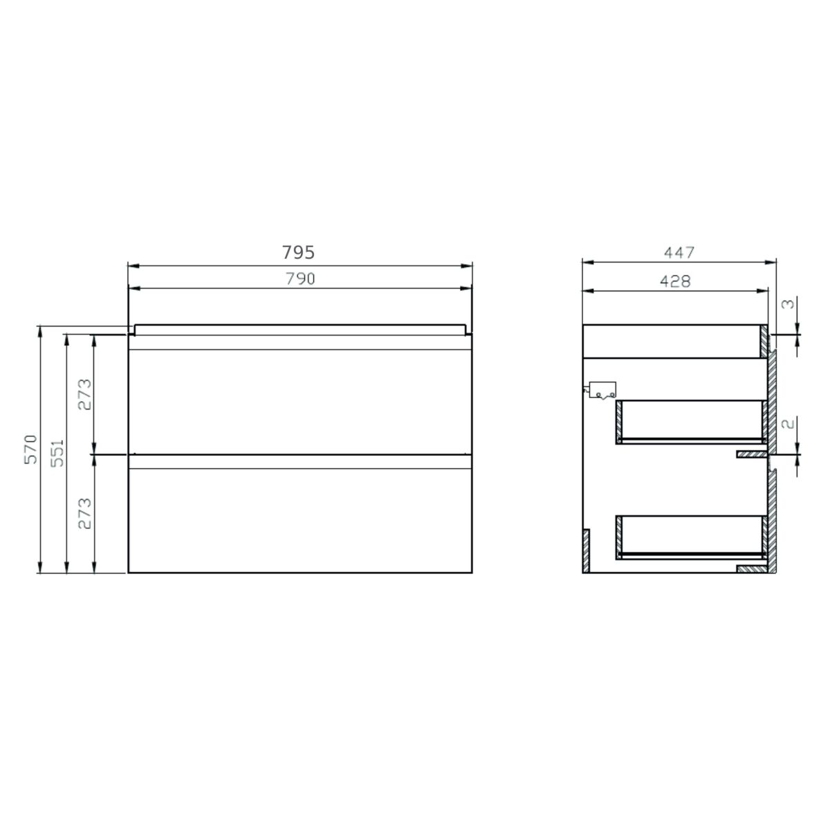 - Die Vorderseite des Schranks besteht aus 19 mm starker MDF-Platte, die grau lackiert ist