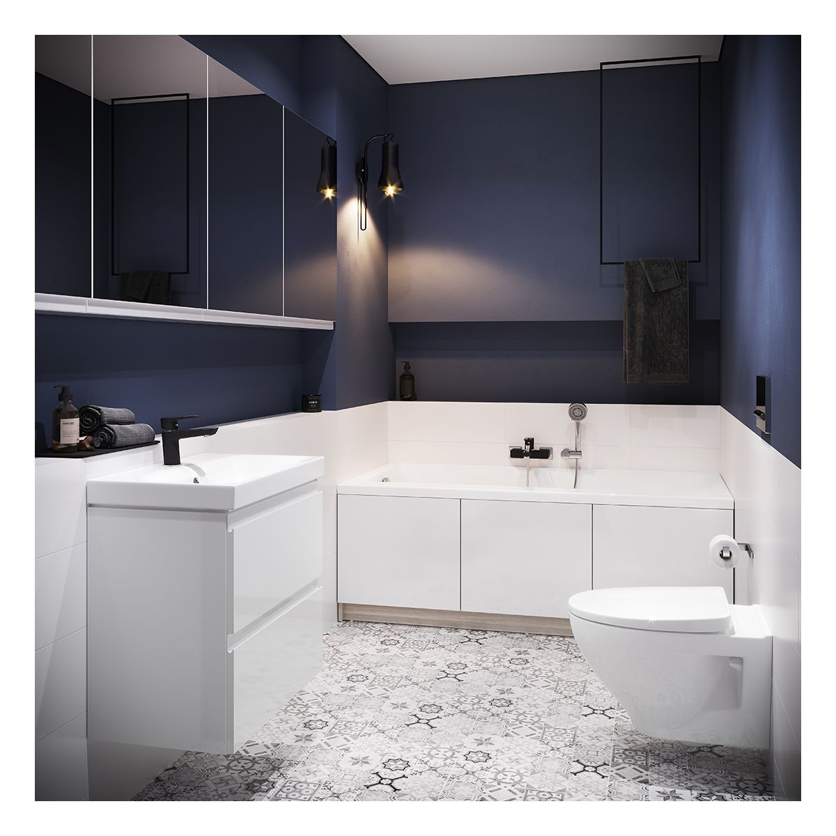 - Der Schrank verfügt über gefräste Griffe und ein System zum leisen Schließen der Schubladen