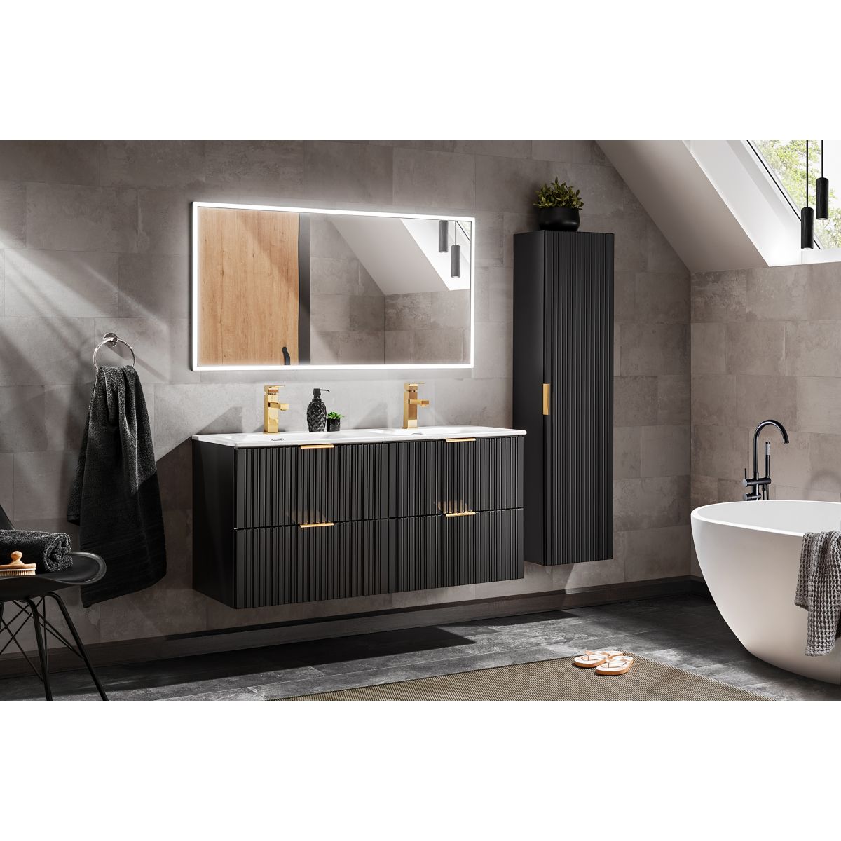 Die neue Kollektion ADEL in den Farben Weiß, Schwarz und Eiche zeichnet sich durch klassische Proportionen und einzigartige vertikal gefräste Fronten aus. Dank dieser Kombination sind die Möbel dieser Kollektion universell einsetzbar und eignen sich sowohl für moderne als auch für klassische Einrichtungen. Ihre hohe Funktionalität garantiert selbst den anspruchsvollsten Nutzern höchsten Komfort. Die Kollektion besteht aus hängenden Waschbeckenunterschränken in den Größen 40 cm, 60 cm und 80 cm, einem hohen Säulenschrank und Arbeitsplatten in den Größen 60 cm, 80 cm und 120 cm, was uns die Möglichkeit gibt, sowohl kleinere als auch größere Sets zusammenzustellen. Ein weiterer Vorteil dieser Kollektion ist die Möglichkeit, die Farbe der Griffe auszuwählen, da für jeden Schrank drei Farboptionen zur Auswahl stehen: Gold glänzend, Chrom glänzend und Schwarz matt.