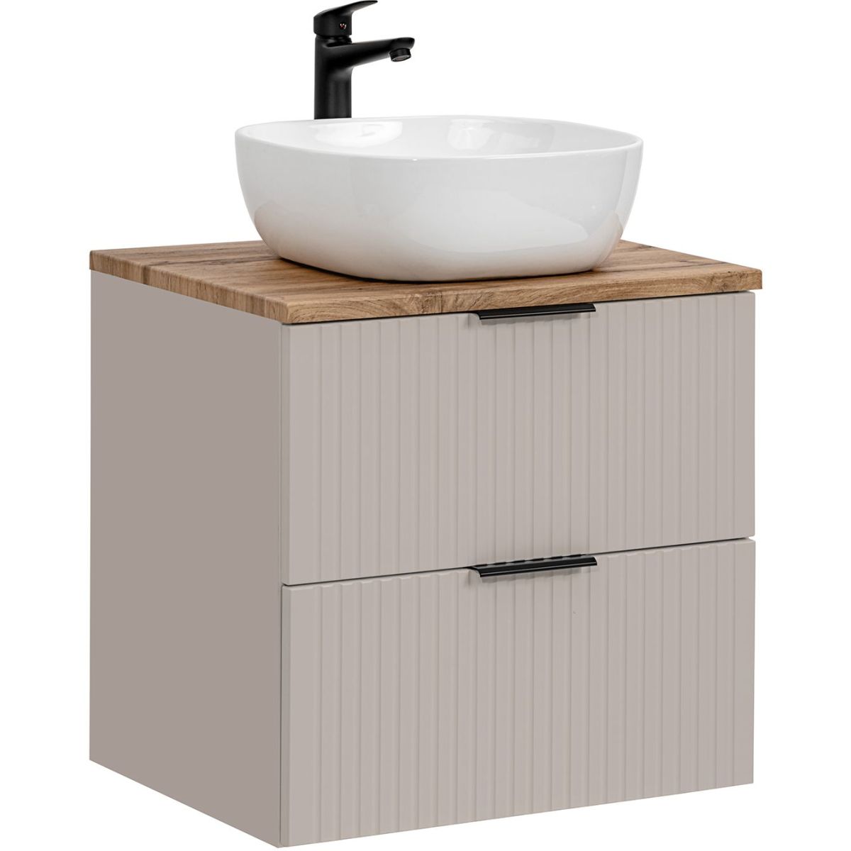 Das Möbelset SET-ADC B WOTAN 60CM SMILE 40 aus der Kollektion Adel Cashmere ist die perfekte Lösung für Ihr Badezimmer. Das Set besteht aus drei Elementen: einem 60 cm breiten Waschbeckenunterschrank in Kaschmir matt mit vertikalen Fräsrillen, einer 46 cm tiefen Arbeitsplatte in Wotan-Eiche und einem eleganten Aufsatzwaschbecken Smile 40 DP.