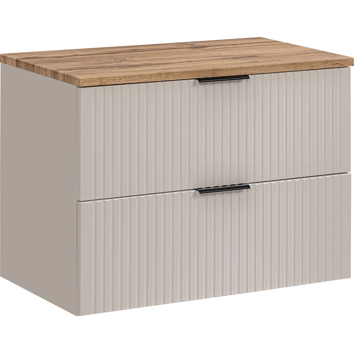 Das Set besteht aus zwei Elementen: dem Waschbeckenunterschrank ADEL CASHMERE 82-80-2S und der Arbeitsplatte UN. 89-80-B WOTAN. Die Fronten sind mit vertikalen Fräsrillen verziert, was ihnen einen einzigartigen Charakter verleiht. Es stehen drei Grifffarben zur Auswahl: Gold glänzend, Schwarz matt und Chrom glänzend, die das moderne Design des Sets zusätzlich unterstreichen.