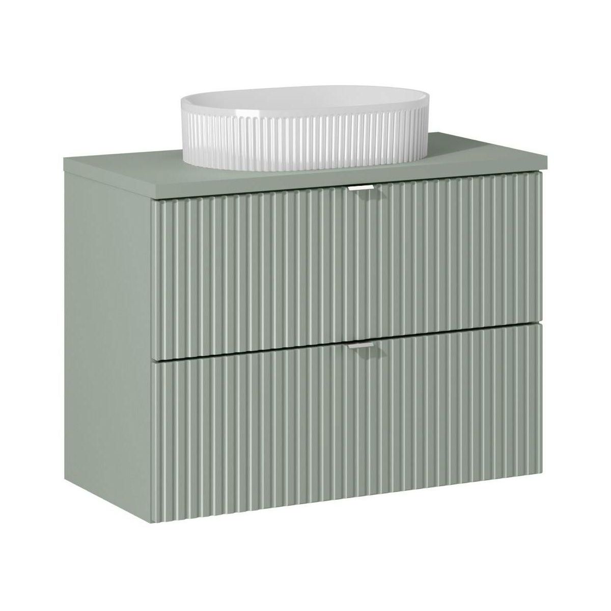 Die Fronten der Möbel sind mit vertikalen Rillen versehen, was ihnen ein modernes Aussehen verleiht. Die silberfarbenen Griffe wirken dezent und passen gut zum Rest der Möbel. Das Set besteht aus drei Elementen: dem Waschbeckenunterschrank ADEL OAK 82-80-B-2S, der Arbeitsplatte LINE REED GREEN B 89-80 und dem Aufsatzwaschbecken BEYOND 5 WHITE (E-6564).