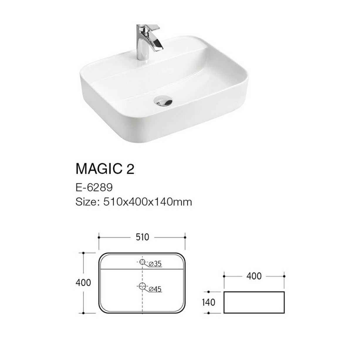 Comad Magic 2 Waschbecken 50x40 cm Aufsatzwaschbecken rechteckig weiß glänzend UM-6289MAGIC50DP