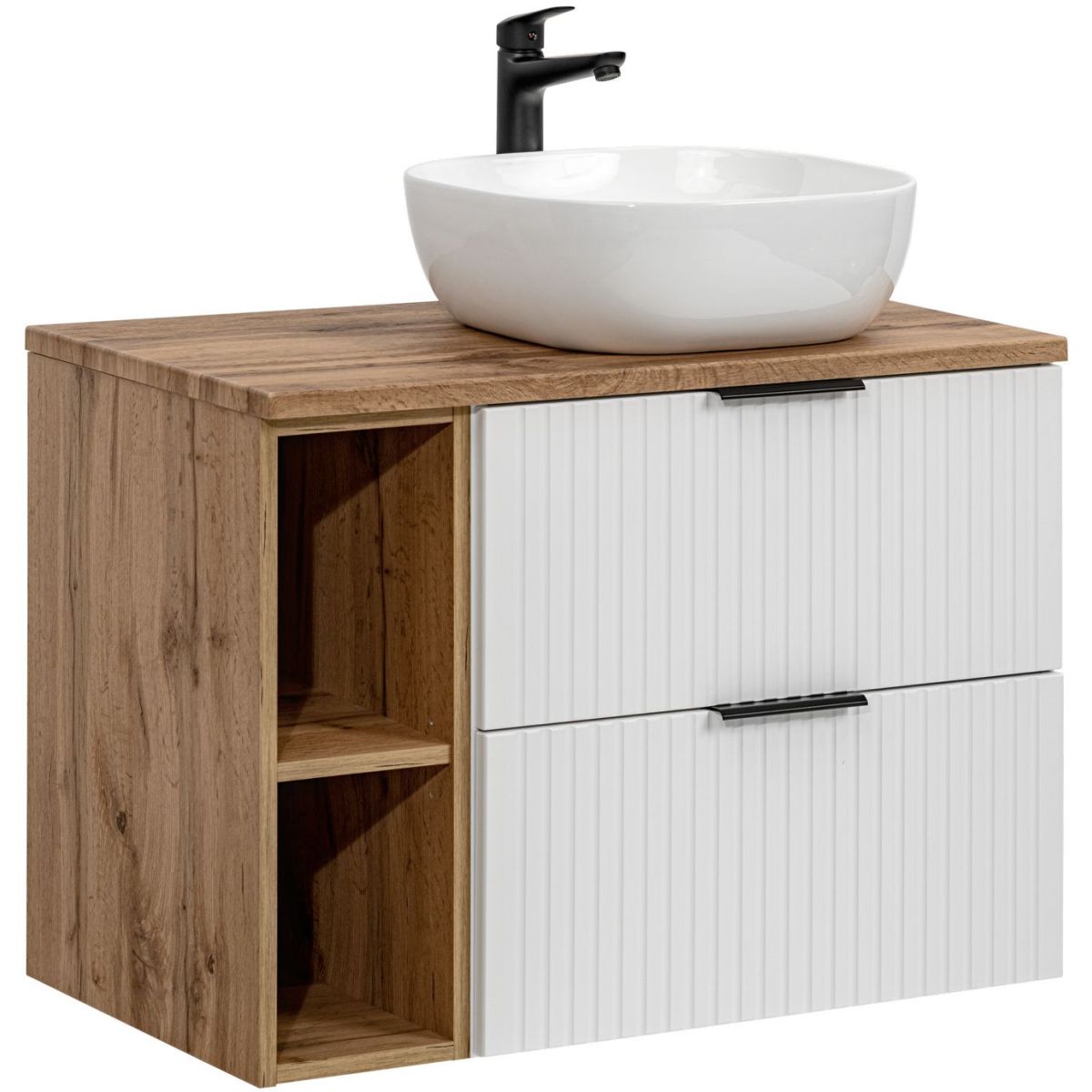 Die neue Kollektion ADEL in den Farben Weiß, Schwarz und Eiche zeichnet sich durch klassische Proportionen und einzigartige vertikal gefräste Fronten aus. Dank dieser Kombination sind die Möbel dieser Kollektion universell einsetzbar und eignen sich sowohl für moderne als auch für klassische Einrichtungen. Ihre hohe Funktionalität garantiert selbst den anspruchsvollsten Nutzern höchsten Komfort. Die Kollektion besteht aus hängenden Waschbeckenunterschränken in den Größen 40 cm, 60 cm und 80 cm, einem hohen Säulenschrank und Arbeitsplatten in den Größen 60 cm, 80 cm und 120 cm, was uns die Möglichkeit gibt, sowohl kleinere als auch größere Sets zusammenzustellen. Ein weiterer Vorteil dieser Kollektion ist die Möglichkeit, die Farbe der Griffe auszuwählen, da für jeden Schrank drei Farboptionen zur Auswahl stehen: Gold glänzend, Chrom glänzend und Schwarz matt.