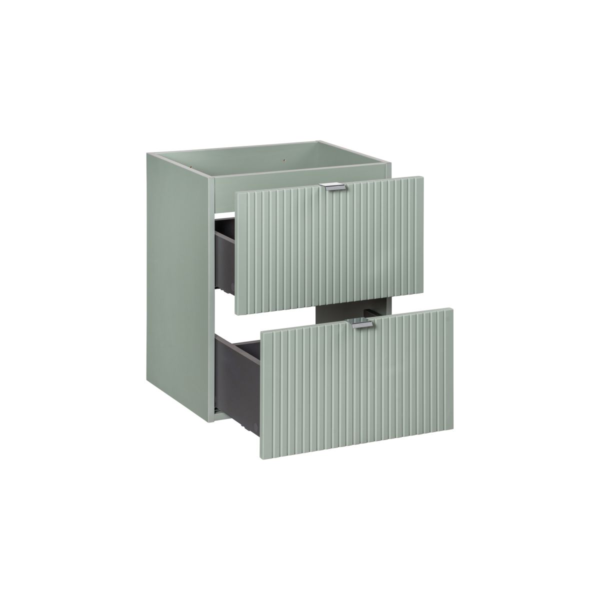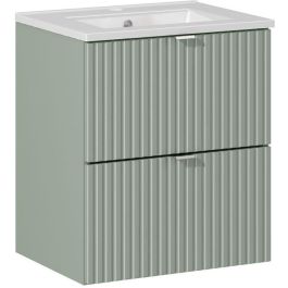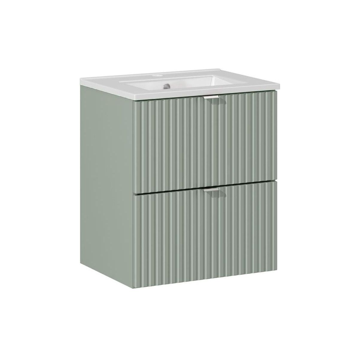 Das Set besteht aus zwei Elementen: einem 50 cm breiten Waschtischunterschrank und einem Waschbecken. Der Waschtischunterschrank ist aus robustem Material in der Farbe Reed Green gefertigt, die dem Innenraum ein frisches und natürliches Aussehen verleiht. Die Fronten des Schranks sind mit vertikalen Fräsrillen verziert, die dem Möbelstück einen originellen Charakter verleihen. Die silberfarbenen Griffe sorgen für Eleganz und erleichtern die Benutzung.