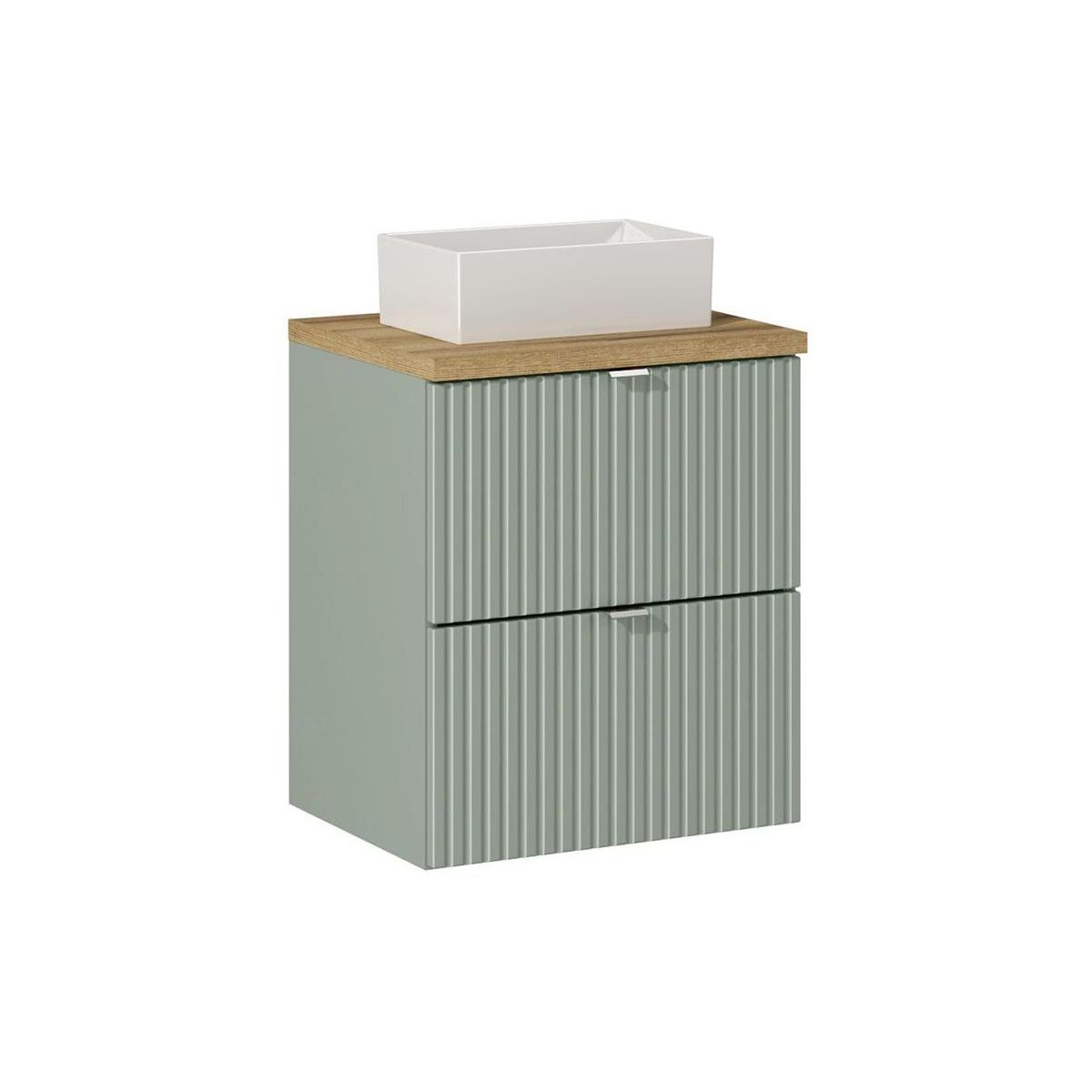 Die Farbgebung des Sets in den Farbtönen Reed Green und Coast Evoke Eiche schafft eine harmonische Komposition, die jedem Badezimmer Charme verleiht. Die Fronten mit vertikalen Fräsrillen verleihen den Möbeln einen modernen Charakter, während die silbernen Griffe ihnen ein elegantes Finish verleihen.