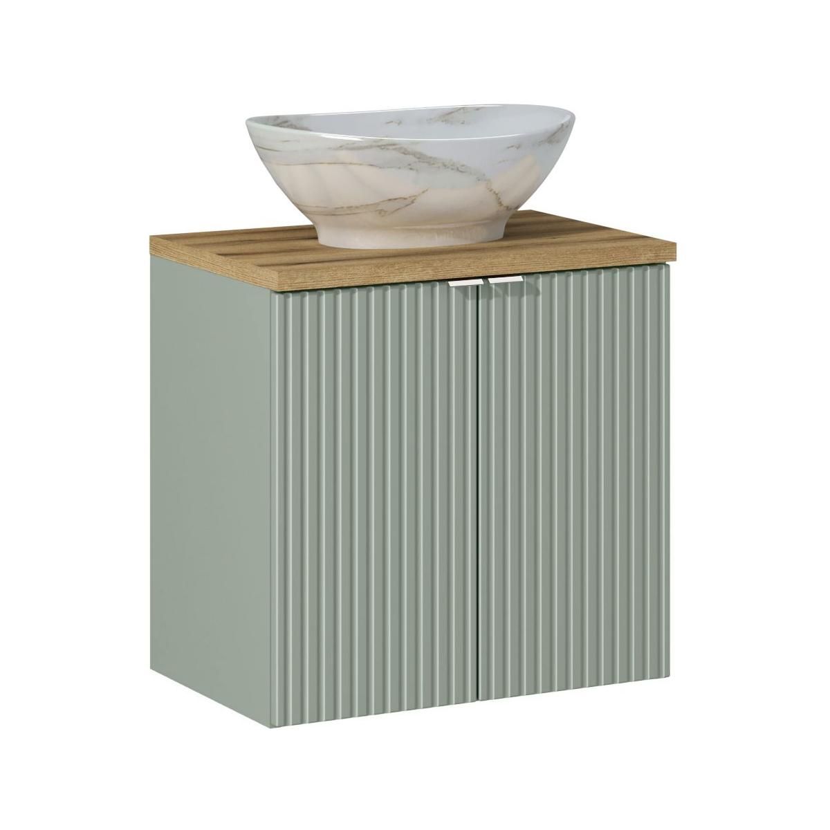 Das Set besteht aus dem Waschbeckenunterschrank LINE REED GREEN D 82-60-2D, der Arbeitsplatte NOVA OAK A 89-60 und dem Aufsatzwaschbecken UN-PATI-MW3. Mit einer Breite von 60 cm und einer Tiefe von 40 cm eignet sich dieses Set ideal für kleinere Badezimmer, in denen jeder Zentimeter zählt.