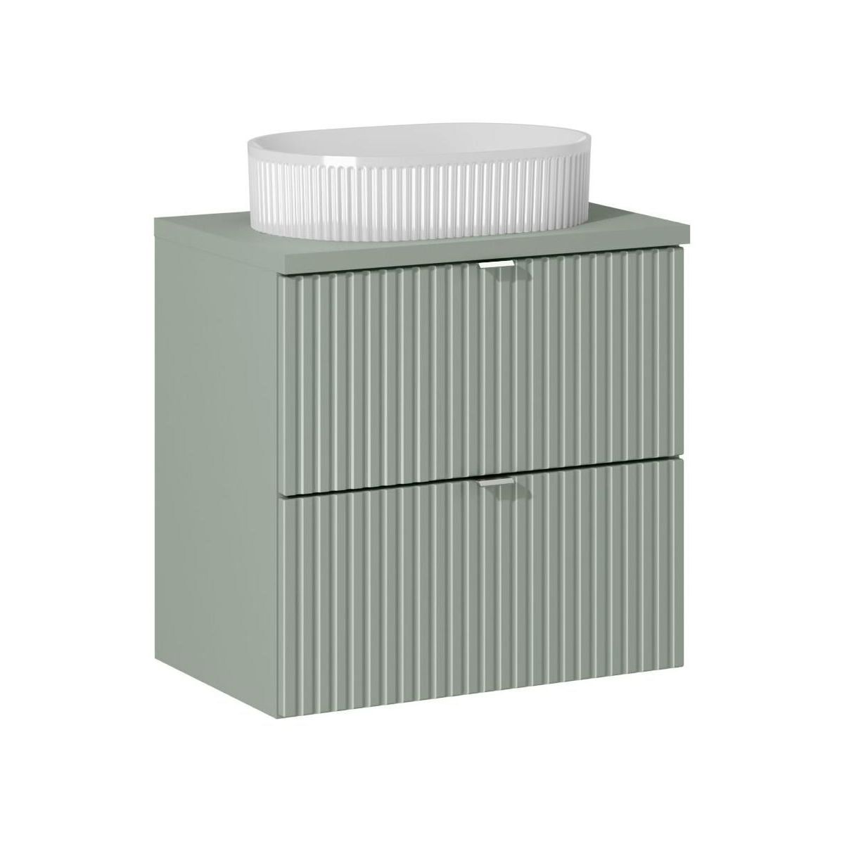 Die Fronten der Möbel sind mit vertikalen Fräsrillen verziert, die ihnen Eleganz und Charakter verleihen. Die silberfarbenen Griffe passen perfekt zur Farbe des Reed Green-Sets. Zusätzlich enthält das Set auch eine Arbeitsplatte und ein Aufsatzwaschbecken Beyond 5 White, das den modernen Charakter der gesamten Komposition unterstreicht.
