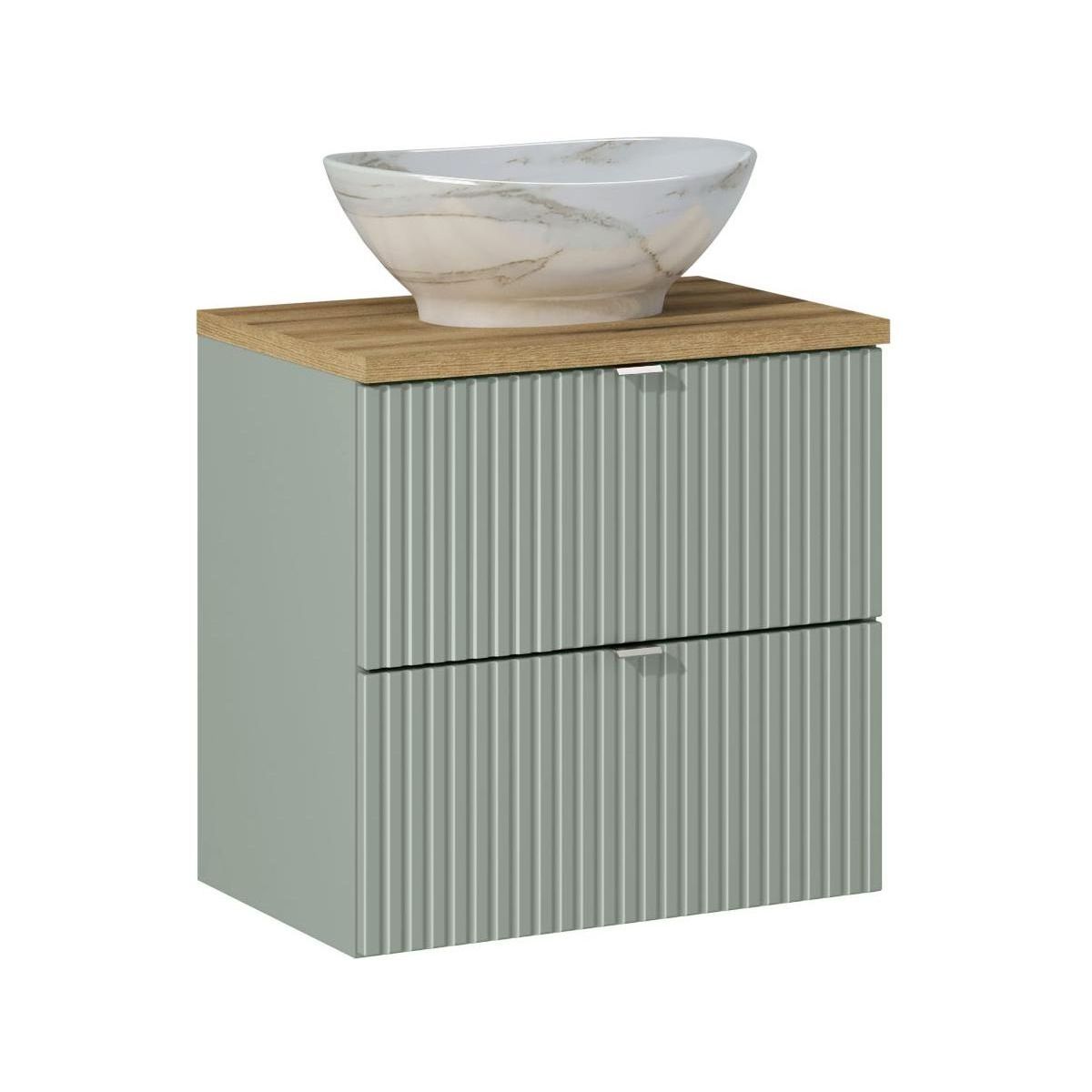Das 60 cm breite Möbelset mit Waschtischplatte und Aufsatzwaschbecken Pati aus der Kollektion Line Reed Green ist die perfekte Lösung für ein Badezimmer mit modernem Design. Das Set besteht aus drei Elementen: einem 60 cm breiten Waschtischunterschrank mit vertikalen Fräsungen in der Farbe Reed Green, einer 40 cm tiefen Arbeitsplatte in der Ausführung Eiche Coast Evoke und einem Aufsatzwaschbecken Pati. Die silberfarbenen Griffe verleihen dem Ganzen Eleganz und Stil.