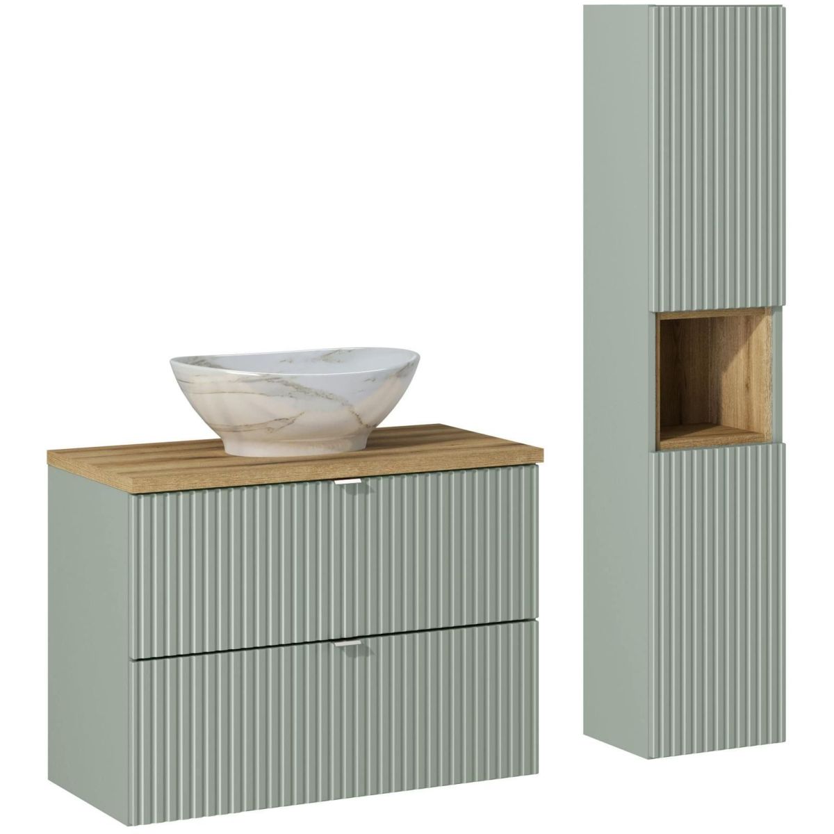 Das 80 cm große Möbelset mit Waschtischplatte, Aufsatzwaschbecken Pati und hohem Schrank ist die perfekte Wahl für alle, die eine moderne und stilvolle Lösung für ihr Badezimmer suchen. Die Elemente dieser Kollektion Line Reed Green in den Farben Reed Green und Eiche Coast Evoke machen das Set nicht nur praktisch, sondern auch ästhetisch ansprechend.