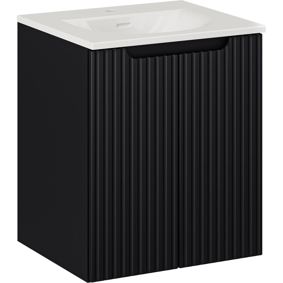Die Fronten mit vertikaler Rillenstruktur verleihen den Möbeln Charakter, und der Griff in Schwarz Matt fügt sich perfekt in das Gesamtbild ein. Das Set besteht aus zwei Elementen: einem Waschbeckenunterschrank (Index: NOVA BLACK D2 82-50-2D) und einem Waschbecken (Index: SKY 3 50 CM DP). Beide Komponenten wurden sorgfältig ausgewählt, um ein harmonisches Ganzes zu schaffen, das sowohl praktisch als auch ästhetisch ist.