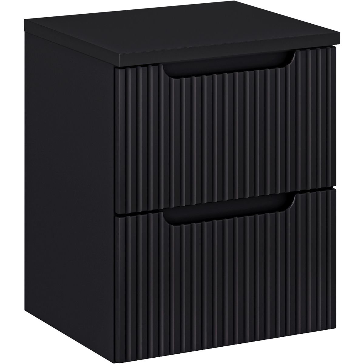 Der Waschtischunterschrank hat vertikale Fräsrillen an den Fronten, die ihm ein modernes Aussehen verleihen. Die mattschwarze Farbe passt perfekt zu den Griffen im gleichen Farbton. Die 50 cm breite Arbeitsplatte rundet das Ganze perfekt ab und verleiht dem Set ein elegantes und stilvolles Aussehen.