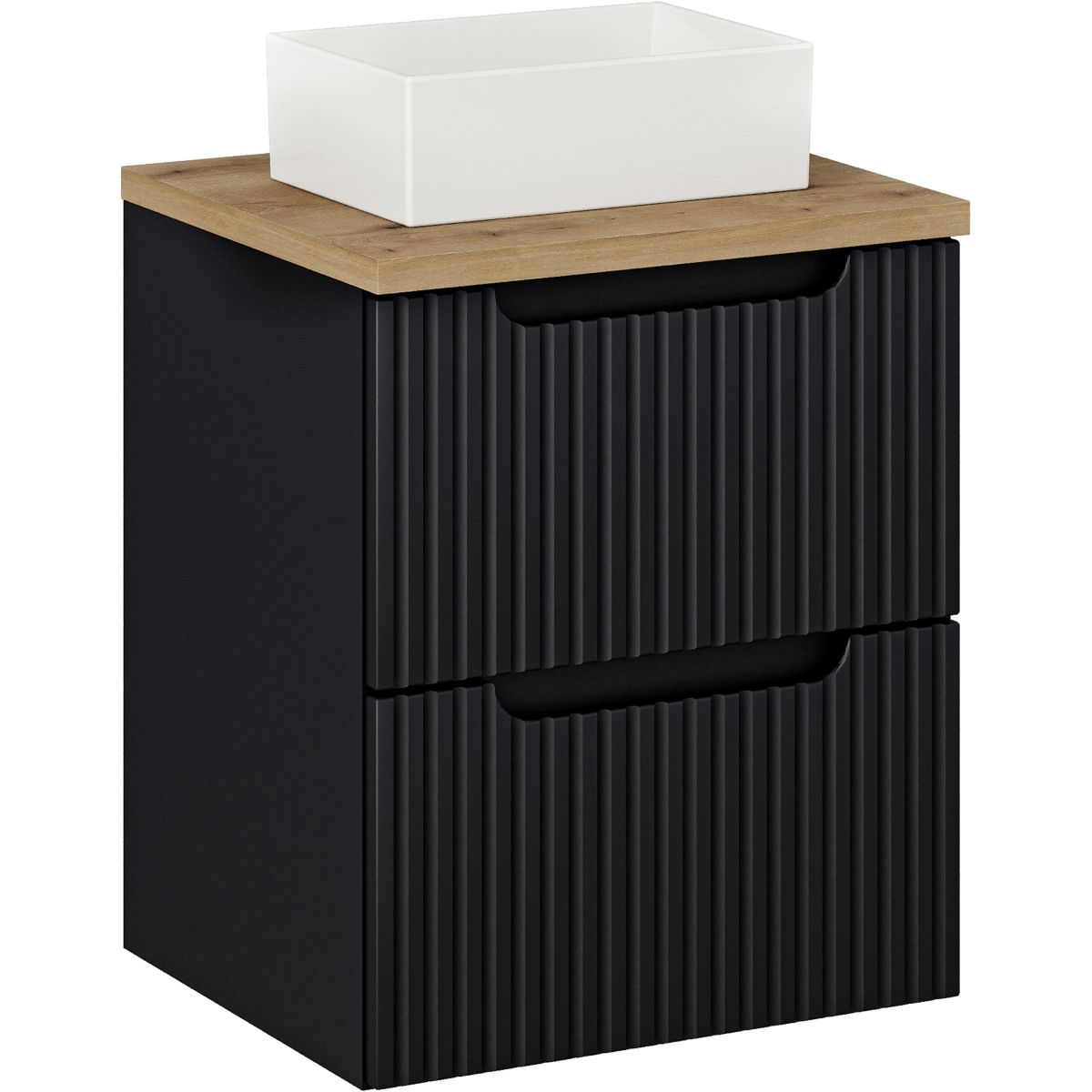 Das Set besteht aus dem Waschbeckenunterschrank NOVA BLACK D2 82-50-2S, der Arbeitsplatte NOVA OAK A 89-50 und dem Aufsatzwaschbecken UN-GAJA35-SW 78570A(35). Der Waschtischunterschrank bietet viel Platz für die Aufbewahrung verschiedener Badezimmeraccessoires, während die Arbeitsplatte und das Aufsatzwaschbecken der gesamten Einrichtung Eleganz und Funktionalität verleihen.