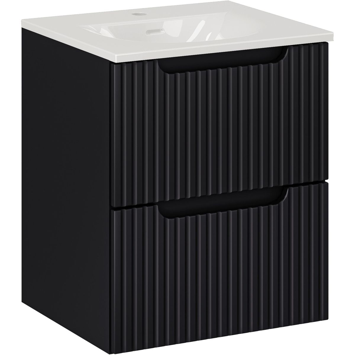 Die Fronten mit vertikaler Rillenstruktur verleihen den Möbeln Charakter, und der Griff in Schwarz Matt passt perfekt zum Gesamtbild. Das Set besteht aus zwei Elementen: einem Waschbeckenunterschrank (Index: NOVA BLACK D2 82-50-2S) und einem Waschbecken (Index: SKY 3 50 CM DP). Beide Komponenten wurden sorgfältig ausgewählt, um ein harmonisches Ganzes zu schaffen, das sowohl praktisch als auch ästhetisch ist.