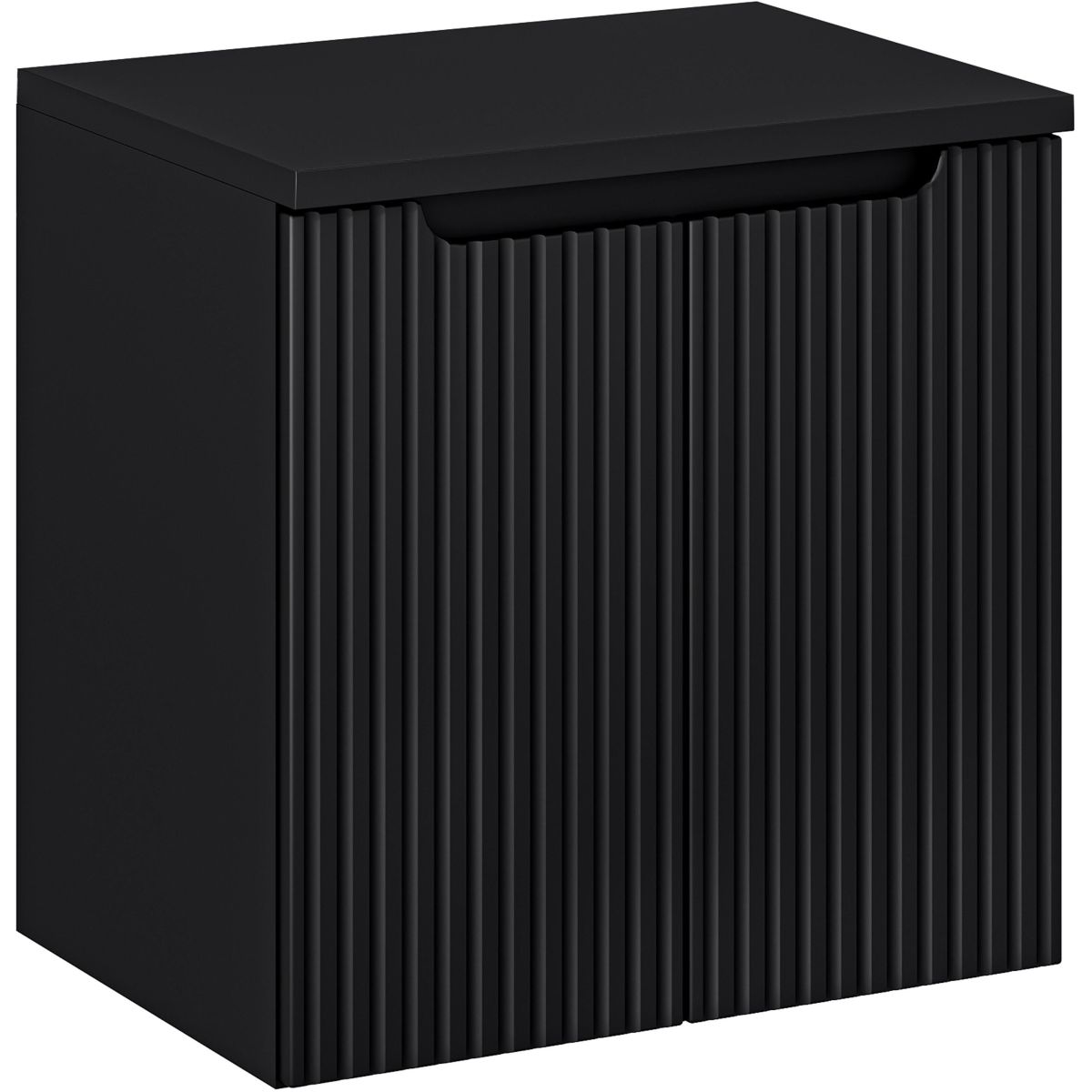 Die Fronten der Möbel sind mit vertikalen Fräsrillen verziert, was ihnen einen einzigartigen Charme verleiht. Die Griffe dieses Sets sind ebenfalls in mattem Schwarz gehalten, was ein einheitliches und elegantes Gesamtbild ergibt.
