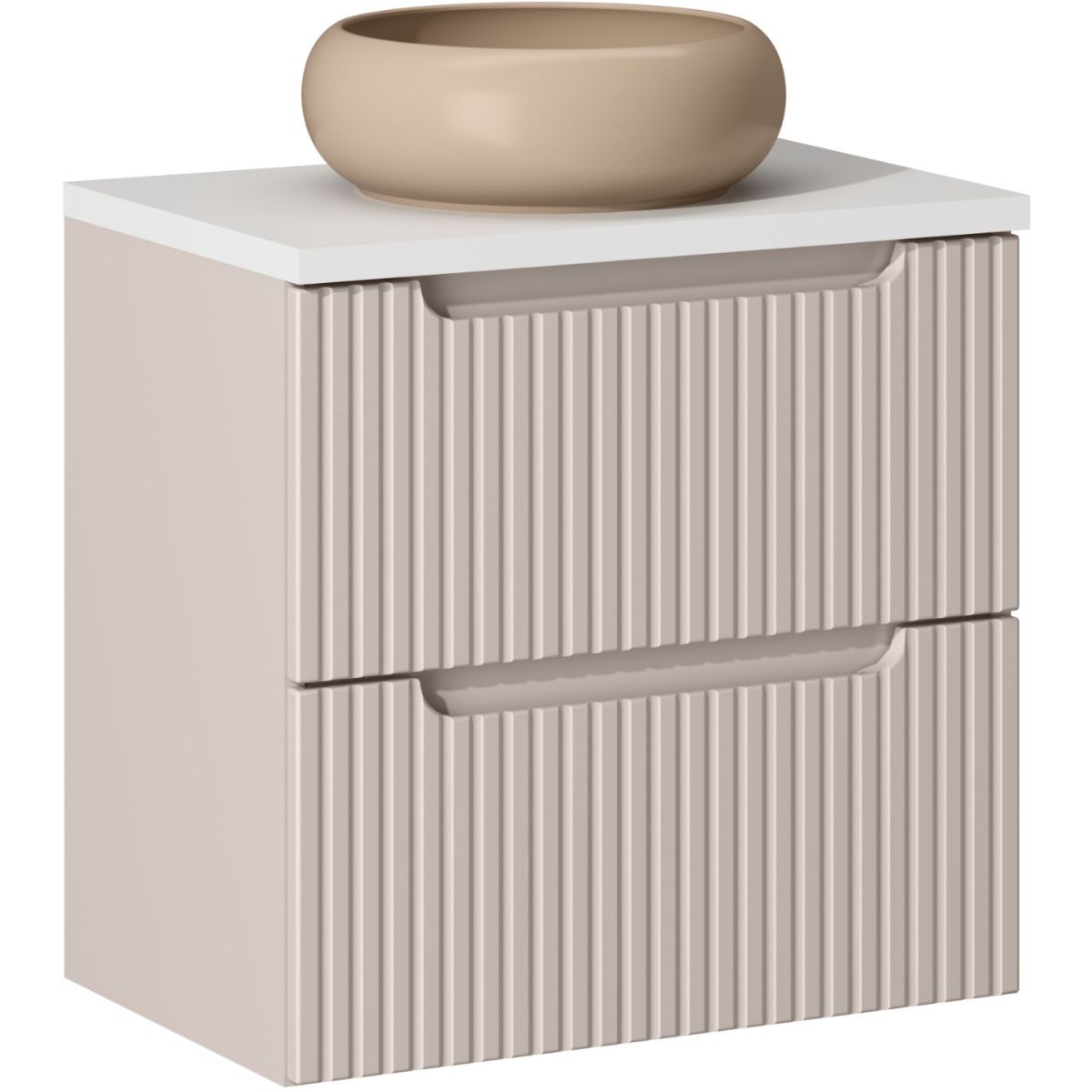 Das Set ist in den Farben Kaschmir Matt und Weiß Matt gehalten, was ihm ein modernes und stilvolles Aussehen verleiht. Die Fronten der Möbel sind mit vertikalen Fräsrillen versehen, die ihnen eine subtile Eleganz verleihen. Die Griffe in Kaschmirfarbe passen perfekt zum Rest des Sets und bilden ein einheitliches und harmonisches Ganzes.