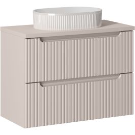Das Set besteht aus drei Elementen: einem Waschbeckenunterschrank, einer Waschtischplatte und einem Aufsatzwaschbecken. Dank einer Breite von 80 cm finden alle notwendigen Hygieneartikel problemlos Platz. Die Farbe Kaschmir matt verleiht dem Set ein modernes und dezentes Aussehen.