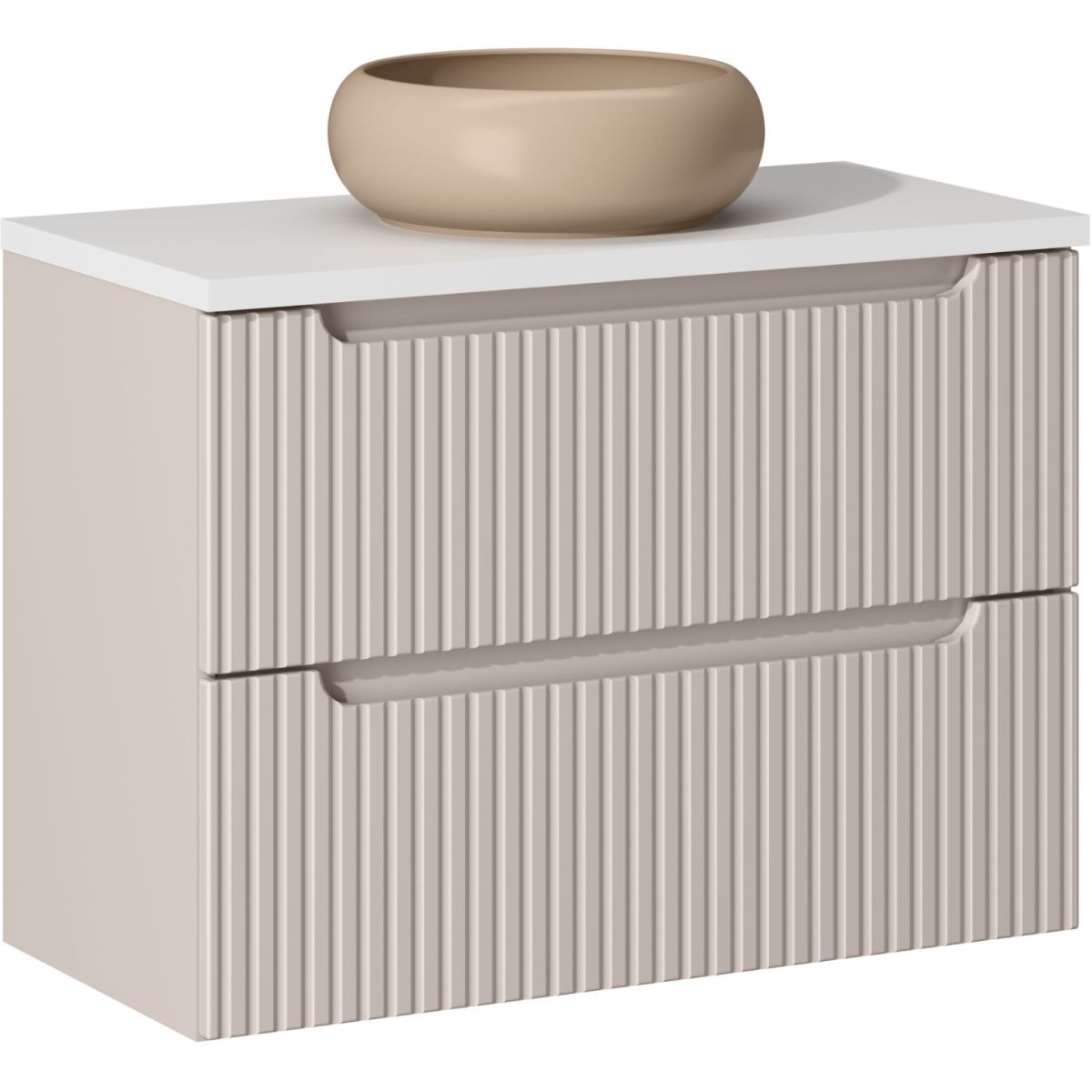 Das 80 cm breite Möbelset Nova Cashmere wurde für moderne Badezimmer entwickelt, die sich durch Eleganz und Funktionalität auszeichnen. Zu diesem Set gehören der Waschtischunterschrank Nova Cashmere 82-80-2S, die Waschtischplatte Nova White 89-80 und das Aufsatzwaschbecken UN-WIKI-MC. Die Farbgebung des Sets ist eine subtile Kombination aus Kaschmir-Matt und Weiß-Matt, die dem Badezimmer Leichtigkeit und Frische verleihen. Die Fronten der Möbel sind mit vertikalen Fräsrillen verziert, die den Möbeln einen modernen Charakter verleihen.