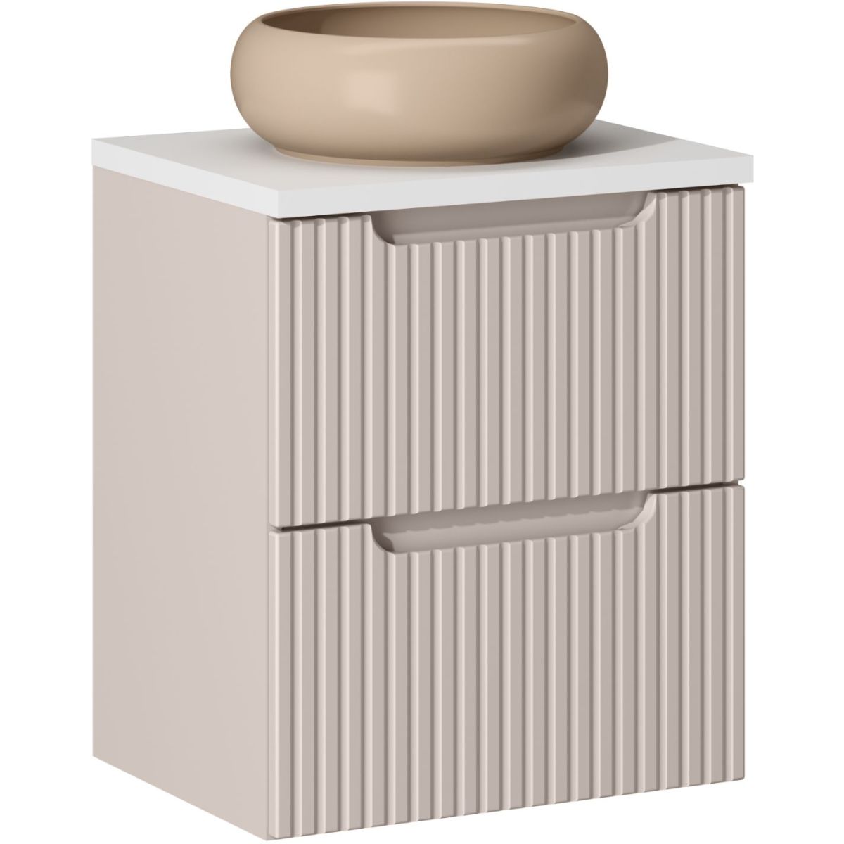 Das Möbelset Nova Cashmere mit dem Index SET-NOC B WHITE 50 CM S UN WIKI C ist die ideale Lösung für alle, die eine elegante und funktionale Badezimmerausstattung suchen. Das Set besteht aus drei Elementen: einem Waschbeckenunterschrank, einer Waschtischplatte und einem Aufsatzwaschbecken Wiki. Der Schrank ist 50 cm breit und 40 cm tief, sodass er viel Platz für notwendige Badezimmeraccessoires bietet. Die Fronten des Schranks sind mit vertikalen Fräsrillen verziert, die den Möbeln einen einzigartigen Charakter verleihen.