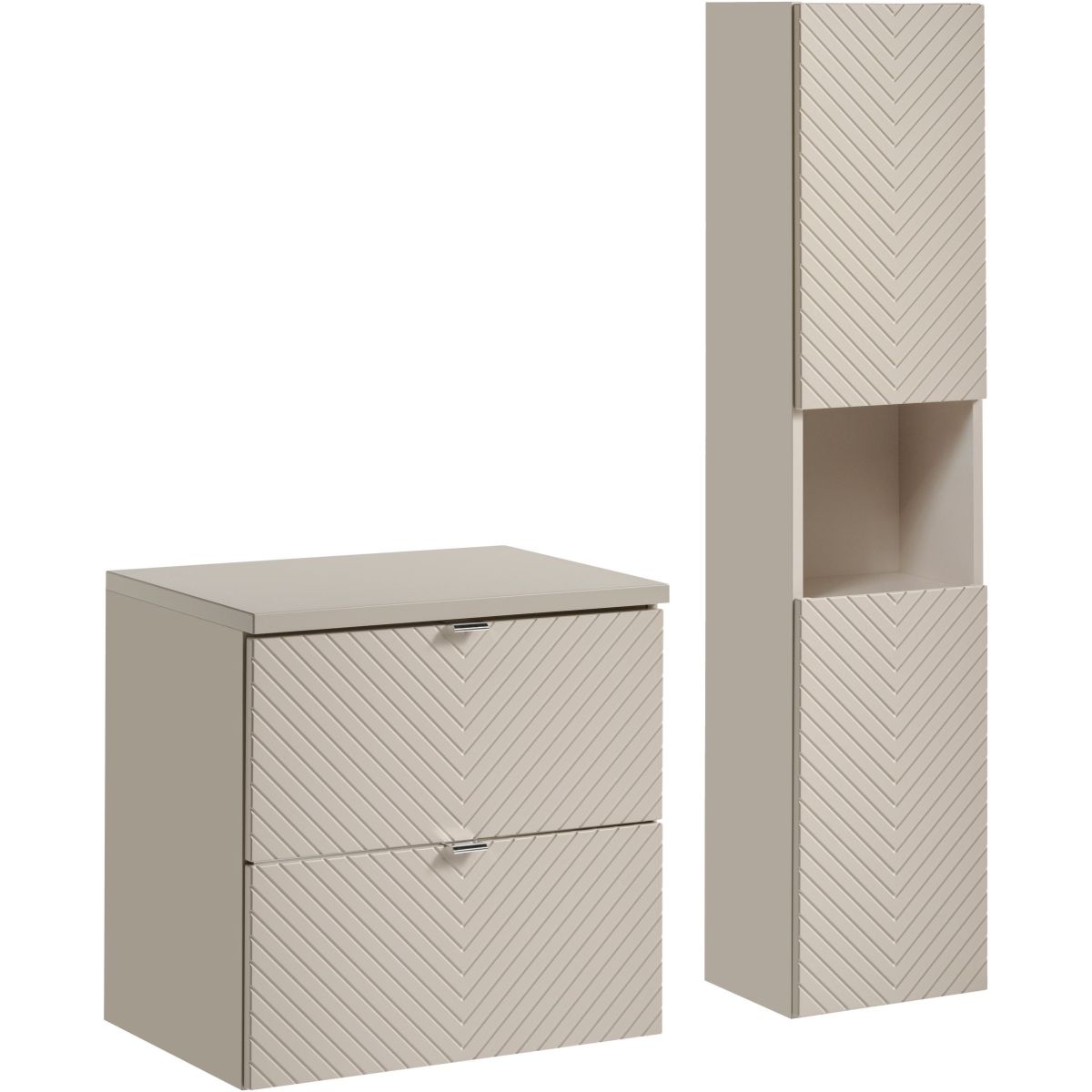 Die Kollektion Viva Cashmere ist eine perfekte Kombination aus Stil und Funktionalität. Die Kollektion wurde für moderne Innenräume entworfen und kombiniert einzigartige, dreidimensionale geriffelte Fronten aus MDF-Platten mit einer ergonomischen Schranktiefe von 40 cm, was eine optimale Raumnutzung gewährleistet. Die Möbel der Kollektion Viva Cashmere sehen nicht nur elegant aus, sondern zeichnen sich auch durch Langlebigkeit und Feuchtigkeitsbeständigkeit aus, was sie zur perfekten Wahl für jedes Badezimmer macht. Drei Farben der Griffe im Set – Goldglanz, Chromglanz und Mattschwarz – ermöglichen es, die Details an den Stil des Interieurs anzupassen und bieten volle Freiheit bei der Gestaltung Ihres eigenen, einzigartigen Raums. Dank der leisen Schließfunktion der Türen und Schubladen bieten die Möbel aus der Kollektion Viva Cashmere Komfort im täglichen Gebrauch, eliminieren Geräusche und erhöhen den Komfort der Hausbewohner. Die präzise Verarbeitung und die sorgfältige Auswahl der Materialien garantieren ein ästhetisches Aussehen und langjährige Zufriedenheit mit der Nutzung.