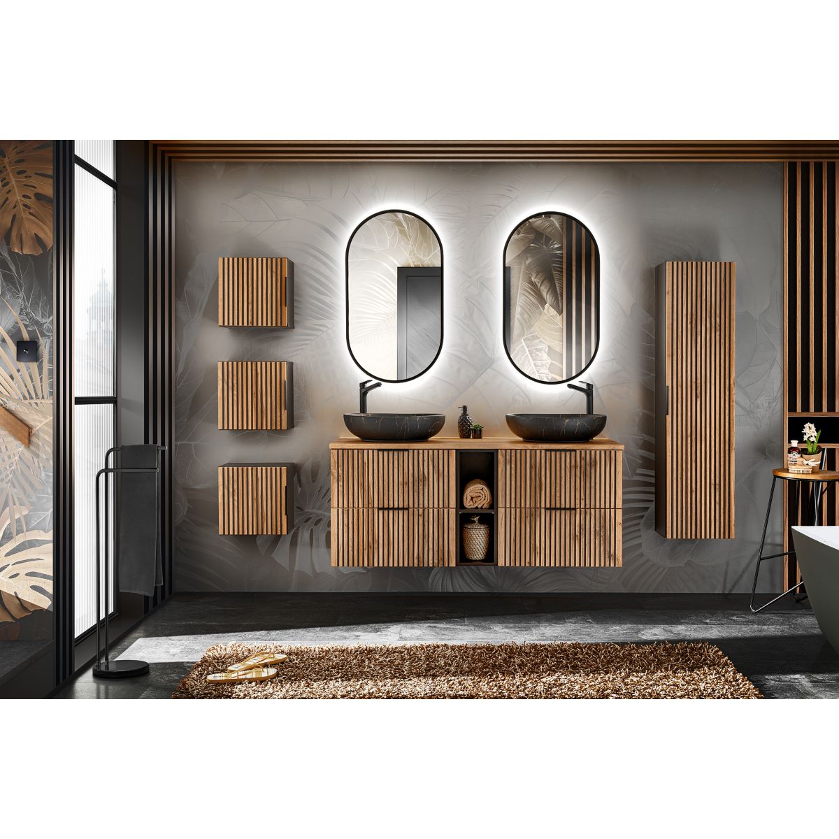 Diese Kollektion besticht durch ihre Farbe und ihren Stil. Die ausdrucksstarken Maserungen der Wotan-Eiche in Kombination mit schwarzen Rillen sind eine Neuheit auf dem Möbelmarkt, die sich immer größerer Beliebtheit erfreut. Die Kollektion umfasst Waschtischunterschränke in verschiedenen Größen, einen hohen Schrank, Würfel und einen Unterschrank, wodurch die Kollektion modular ist und die Möglichkeit bietet, Sets für Badezimmer jeder Größe zusammenzustellen. Die Xilo-Kollektion steht nicht nur für Qualität und modernes Design, sondern auch für Komfort und Funktionalität. Für die Waschbeckenschränke können sowohl Möbelwaschbecken verwendet als auch mit Arbeitsplatten kombiniert und ein Waschbecken aus unserem umfangreichen Angebot ausgewählt werden.