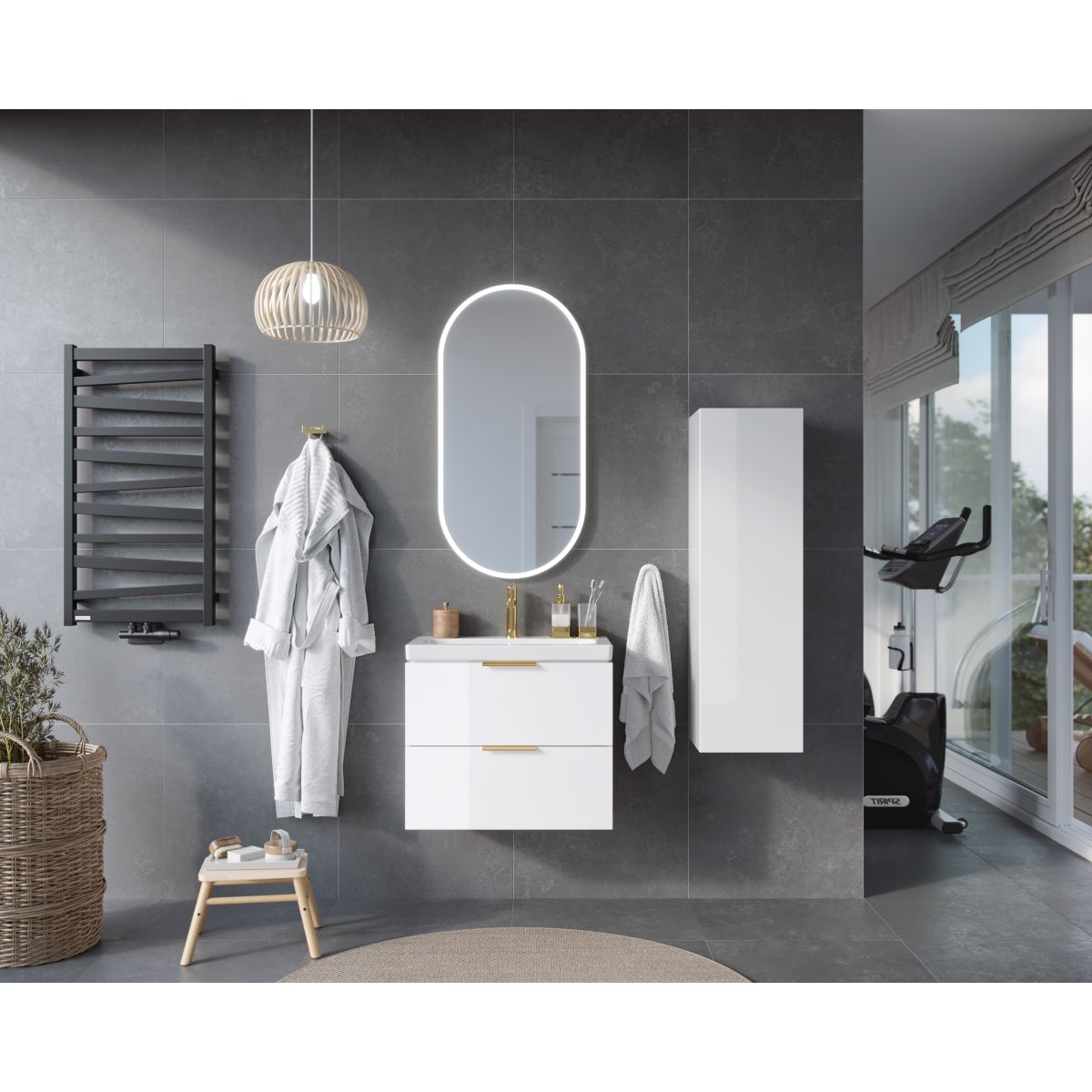 Die neue Möbelserie Blanko ist die ideale Wahl für alle, die ein kleines Badezimmer mit funktionalen und kompakten Möbeln ausstatten möchten. Waschbeckenunterschrank 64 cm, schwarz matt. Mit einer Tiefe von nur 37 cm passt er selbst in das kleinste Badezimmer und ist dank des speziell geformten Waschbeckens dennoch komfortabel zu benutzen. Die Fronten des Schranks sind mit einer hochwertigen Lackierung versehen und schützen das Möbelstück in einem anspruchsvollen Raum wie dem Badezimmer. Die angebotenen Farben werden derzeit sehr häufig in der Badgestaltung verwendet, da sie sich gut mit anderen Farben im Raum kombinieren lassen. Der Schrank ist mit Hettich-Führungen (¾-Auszug) mit Softclose-Funktion ausgestattet, und die obere Schublade verfügt über einen integrierten Holzorganizer.