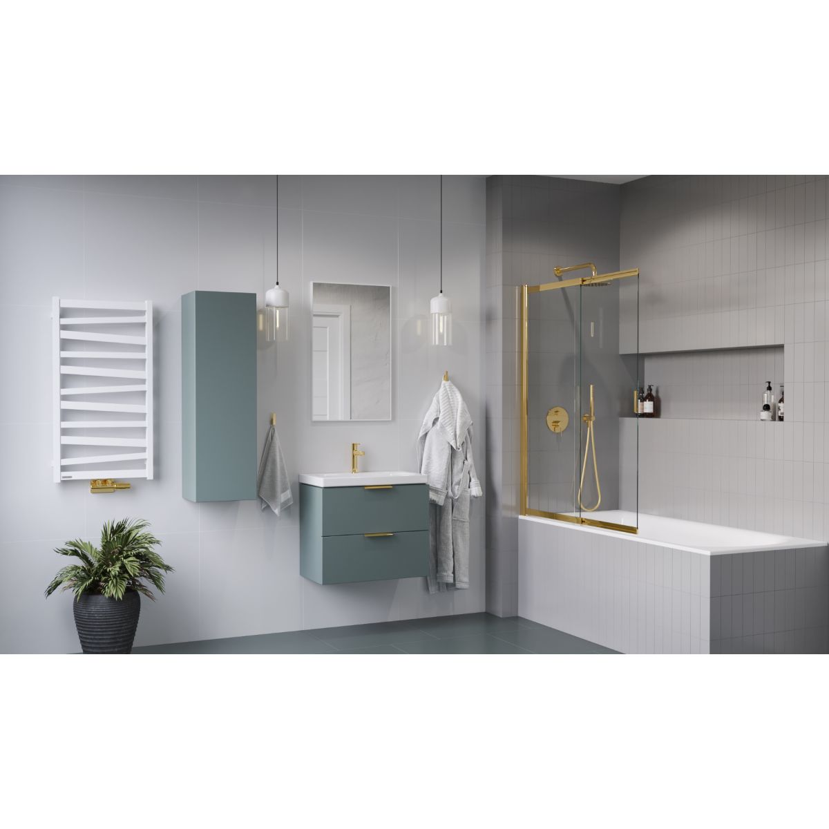 Die neue Möbelserie Blanko ist die ideale Wahl für alle, die ein kleines Badezimmer mit funktionalen und kompakten Möbeln ausstatten möchten. Waschbeckenunterschrank 64 cm, mattgrün. Mit einer Tiefe von nur 37 cm passt er selbst in das kleinste Badezimmer und ist dank des speziell geformten Waschbeckens dennoch komfortabel zu benutzen. Die Fronten des Schranks sind mit einer hochwertigen Lackierung versehen und schützen das Möbelstück in einem anspruchsvollen Raum wie dem Badezimmer. Die angebotenen Farben werden derzeit sehr häufig in der Badgestaltung verwendet, da sie sich gut mit anderen Farben im Raum kombinieren lassen. Der Schrank ist mit Hettich-Führungen (¾-Auszug) mit Soft-Close-Funktion ausgestattet, und die obere Schublade verfügt über einen eingebauten Holzorganizer. Im Lieferumfang enthalten sind 2 Aluminiumgriffe in Goldglanz.