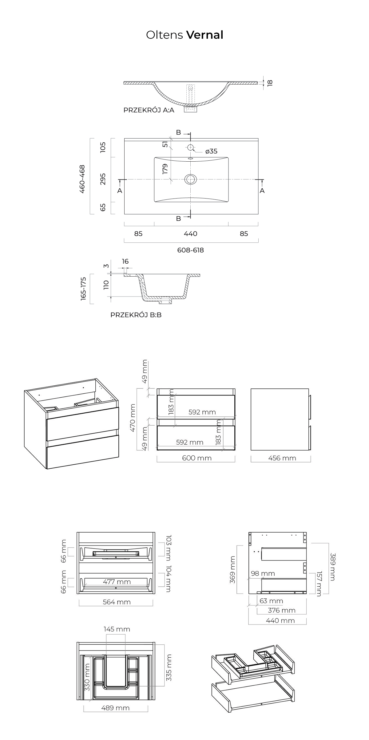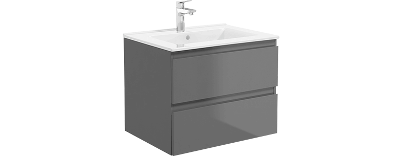 ‑ Breite des Beckens 61 cm ‑ Tiefe des Waschbeckens 46 cm ‑ Höhe des Waschbeckens 17 cm ‑ Loch für Armatur Ø35 mm ‑ Schrankbreite 59,6 cm ‑ Schranktiefe 45,65 cm ‑ Höhe des Schranks 47 cm Farbe des Schranks entspricht RAL7043