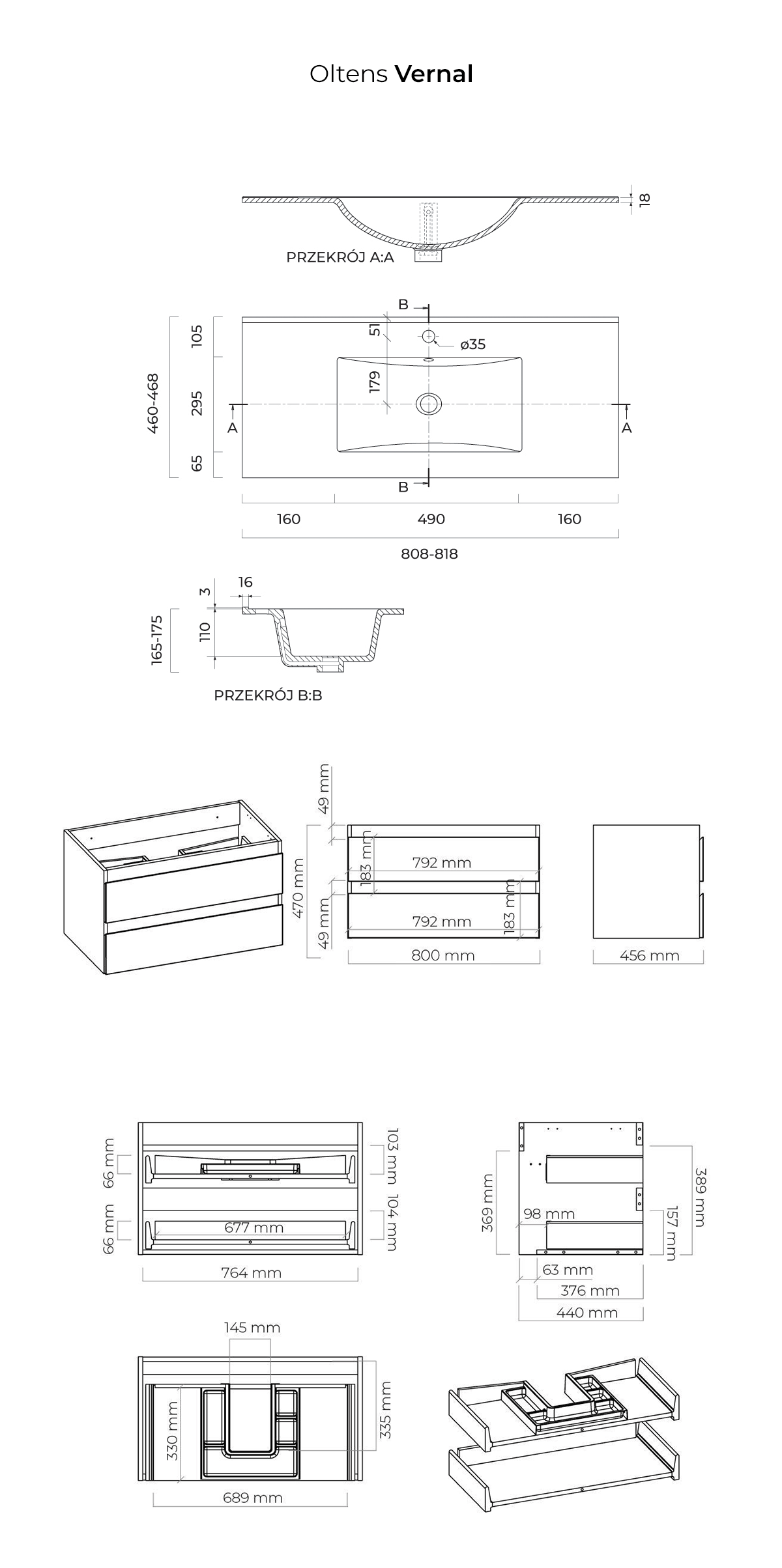 ‑ Breite des Beckens 81 cm ‑ Tiefe des Waschbeckens 46 cm ‑ Höhe des Waschbeckens 17 cm ‑ Loch für Armatur Ø35 mm ‑ Schrankbreite 79,6 cm ‑ Schranktiefe 45,6 cm ‑ Höhe des Schranks 47 cm