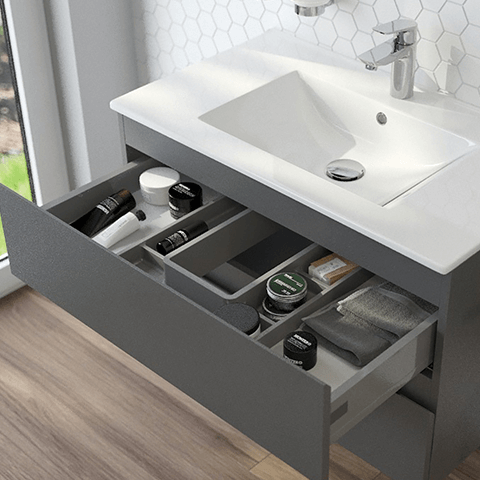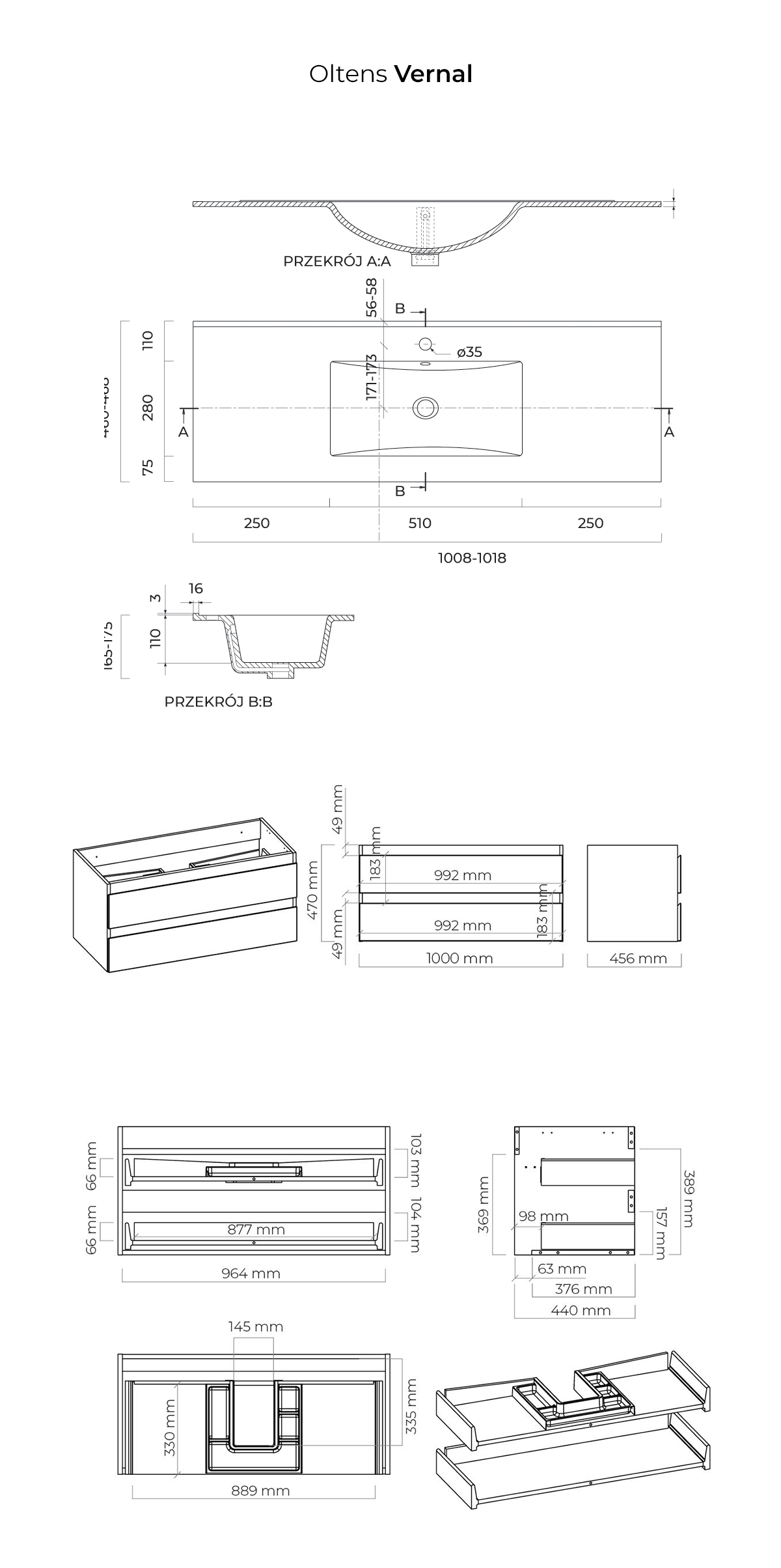 der Schrank ist mit 2 Schubladen mit dem Oltens QuietClose‑System ausgestattet. Sie ermöglichen ein leises und sanftes Schließen von Schubladen Die im Schrank verwendeten Schubladenführungen ermöglichen Vollauszüge, wodurch die Nutzung der Schubladen komfortabler wird Metallschubladen, Organizer in der obersten Schublade. Schrank aus MDF, UV‑beständige Lackbeschichtung (matt)