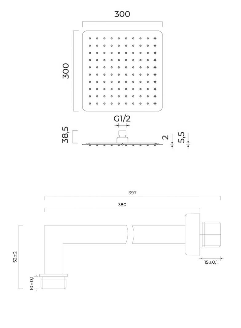 Regenbrause Quadratisch , Abmessungen 300 mm x 300 mm