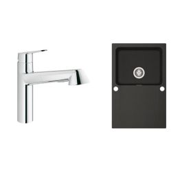Die komfortable Eurodisc Cosmopolitan Küchenarmatur bietet zwei Arten von Wasserstrahl. Ihre glänzende StarLight®-Beschichtung bildet einen fantastischen Kontrast zum dunklen Orion Onyx-Spülbecken.