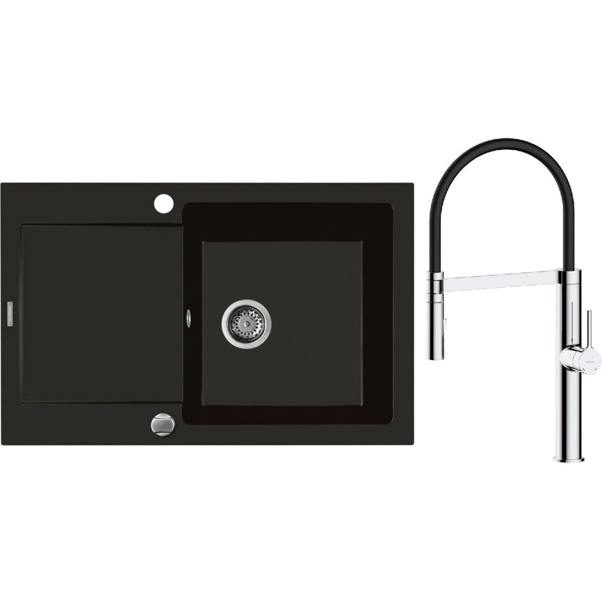1. Oltens Gravan Granitspüle mit 1 Becken und kurzem Abtropffeld 79 x 50 cm, schwarz matt 72100300