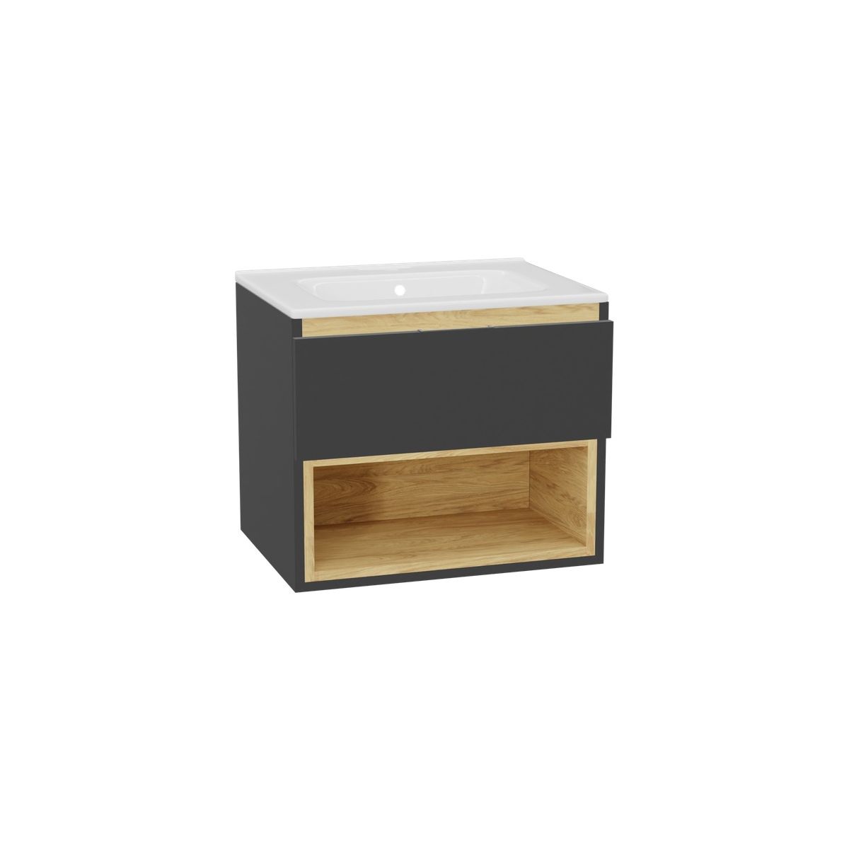 Tuto 2.0 moderner Waschbeckenunterschrank mit einer geräumigen Schublade und einem praktischen offenen Staufach. Die Fronten werden komplett mit Griffen geliefert. Alle Fronten sind farblich auf den Schrankkorpus abgestimmt. Der Schrank verbindet Funktionalität mit modernem Design. Dank der vielfältigen Konfigurationsmöglichkeiten lässt sich das Möbelstück an den individuellen Stil und die Bedürfnisse jedes Badezimmers anpassen. Die Fronten der Schubladen werden mit Griffen geliefert. Der Schrank und die Schublade werden komplett montiert geliefert. Die Fronten und die Arbeitsplatte/das Waschbecken müssen selbst montiert werden.