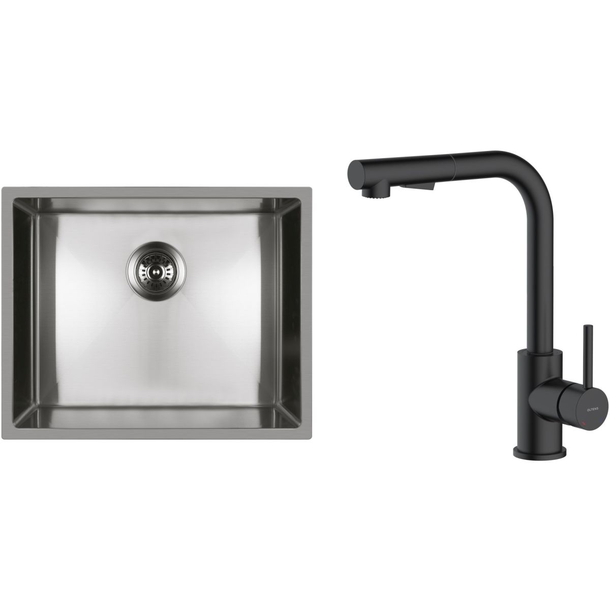 - im Lieferumfang enthalten: Siphon mit Anschlussmöglichkeit für Geschirrspüler, manuell mit Abfallkorb. Schablone zum Ausschneiden der Öffnung in der Arbeitsplatte, Montageset für die Unterbau-Montage