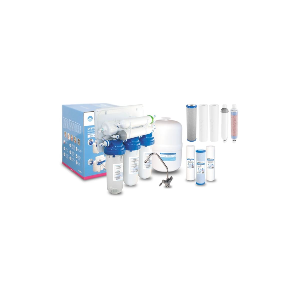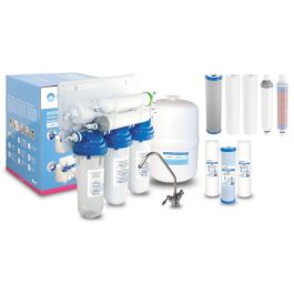 Klassisches Umkehrosmose-System mit einer Osmosemembran mit einer Leistung von 75 GBP (das System ermöglicht die Gewinnung von bis zu 280 Litern gereinigtem Wasser pro Tag) und einem Tank mit einem Fassungsvermögen von 8 Litern.