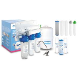 Klassisches Umkehrosmose-System mit einer Osmosemembran mit einer Kapazität von 75 GBP (das System ermöglicht die Gewinnung von bis zu 280 Litern gereinigtem Wasser pro Tag) und einem 8-Liter-Tank.