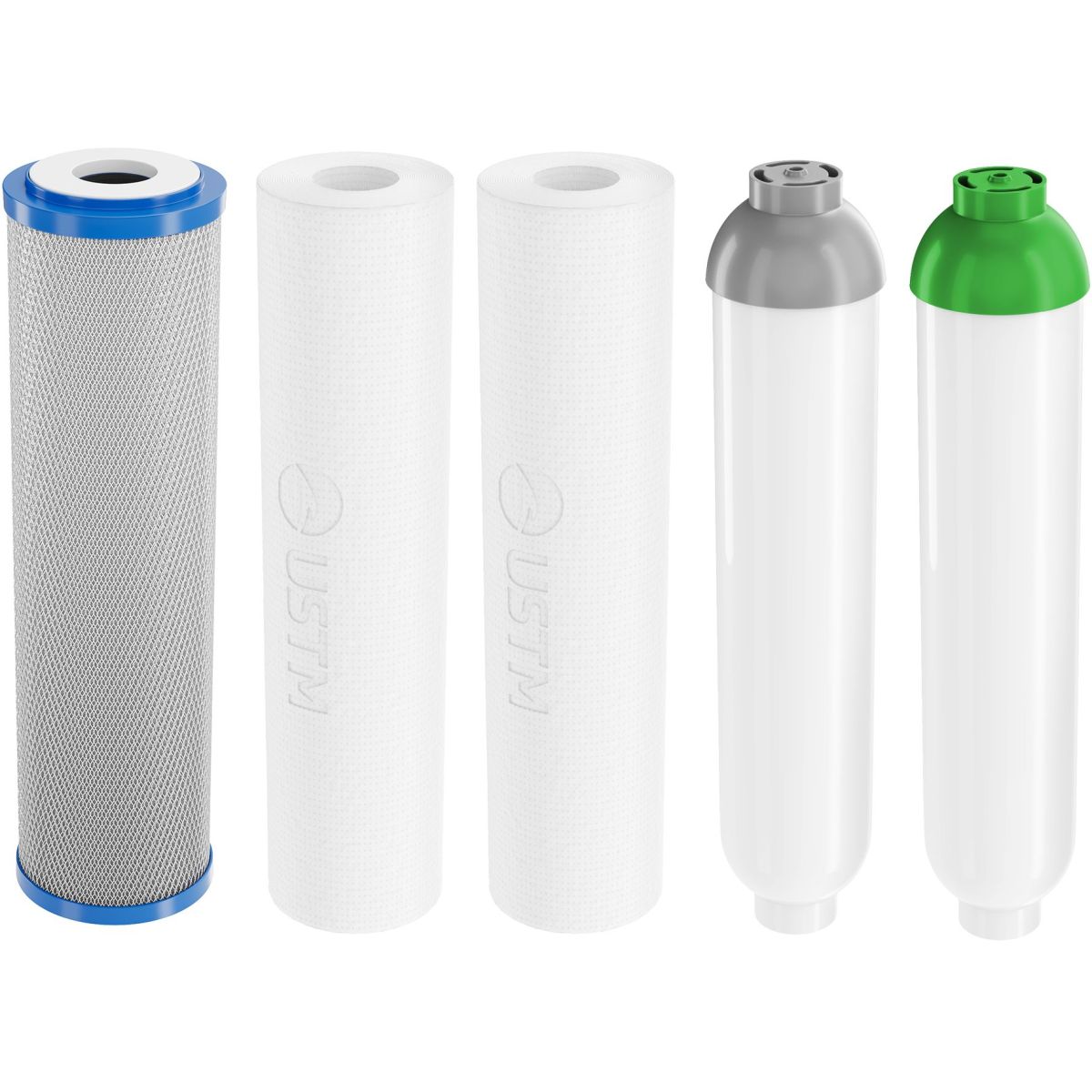 Kompletter Satz austauschbarer Kartuschen für das Umkehrosmose-System RO6 USTM L-MIN, der eine effektive Filterung und hervorragende Wasserqualität gewährleistet. Der regelmäßige Austausch der Kartuschen garantiert einen optimalen Betrieb des Systems und sauberes, gesundes Wasser ohne Verunreinigungen.