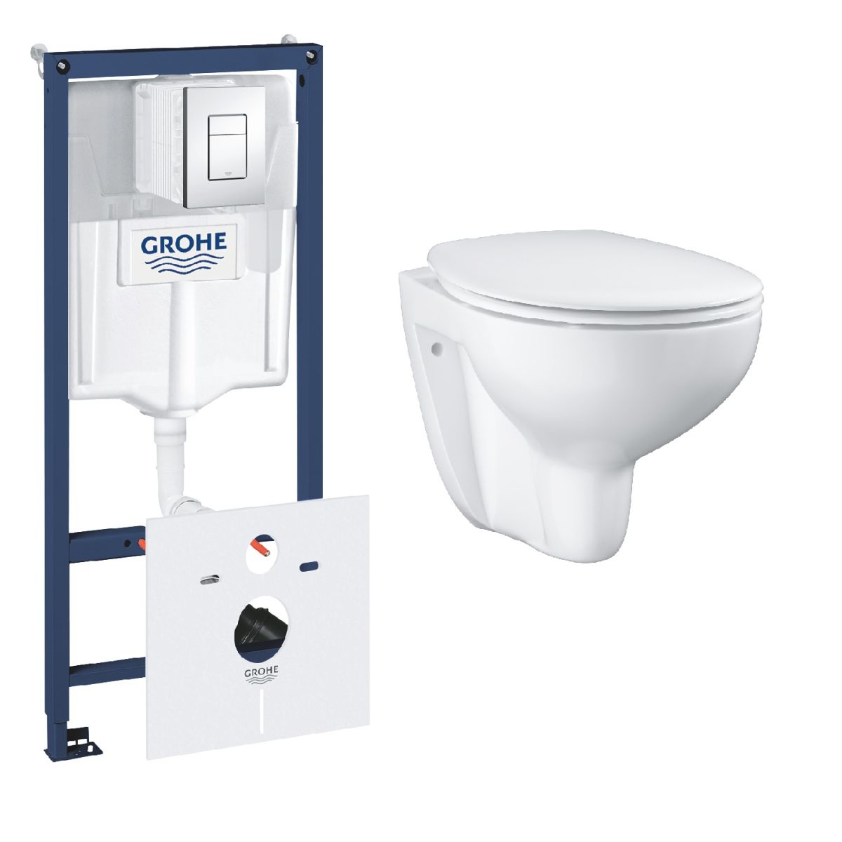 Flankeloses WC-Becken Grohe Bau Ceramic für Wandmontage (inklusive Soft-Close-Sitz), mit Unterputz-Montagegestell Grohe Rapid SL (komplett mit Distanzhaltern, Dämmmatte, Fresh-Behälter für Erfrischungswürfel und Spülknopf in Chrom). Weiße Keramik.