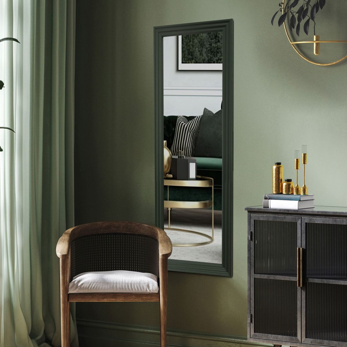 Hängender Spiegel, vertikal oder horizontal montierbar. Material: MDF mit hochwertiger Furnierbeschichtung, Spiegelglas, Retro-Rahmen in Wellenform mit 3D-Effekt in Dunkelgrün.
