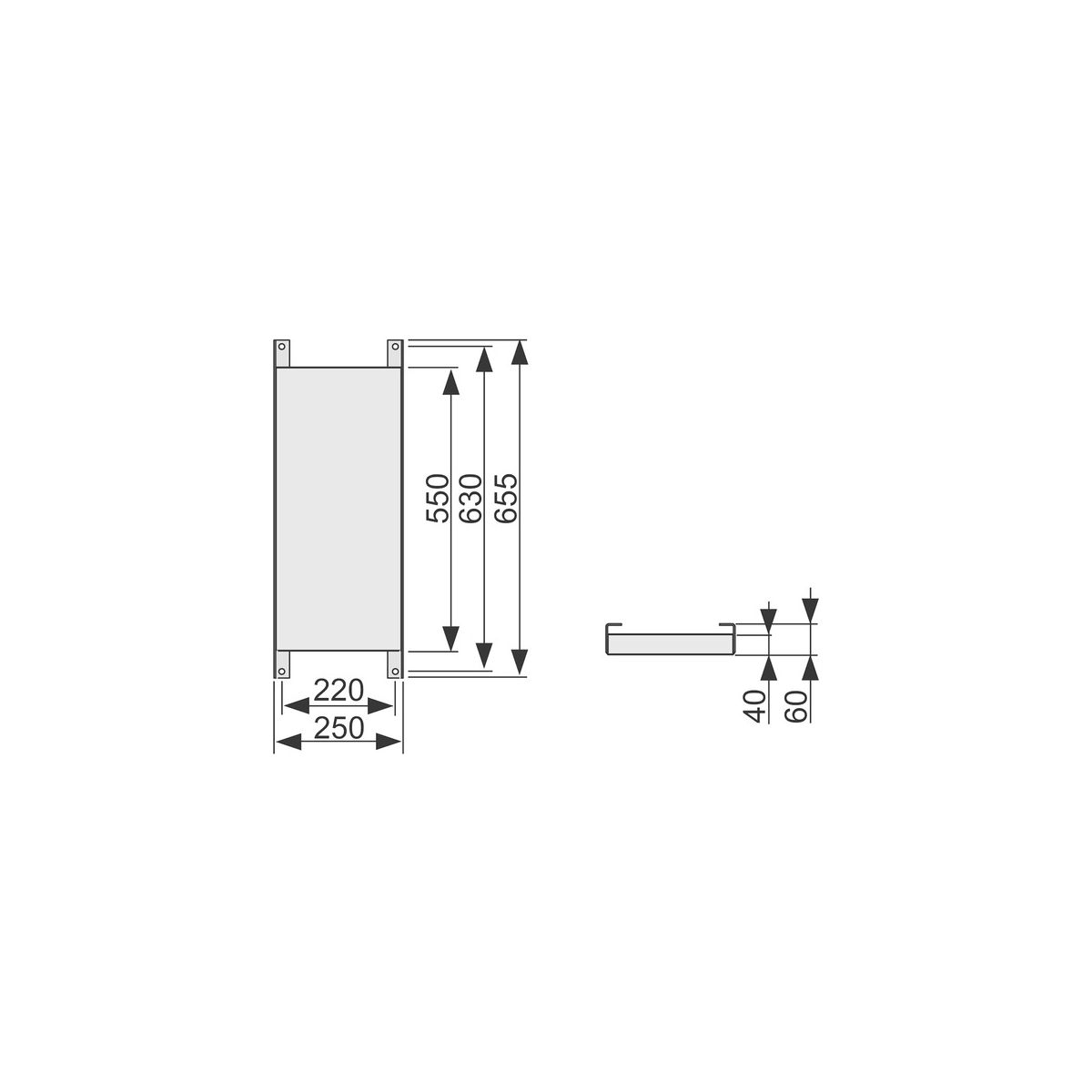 Abmessungen der Traverse: 655 x 250 x 60 mm