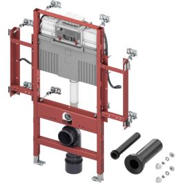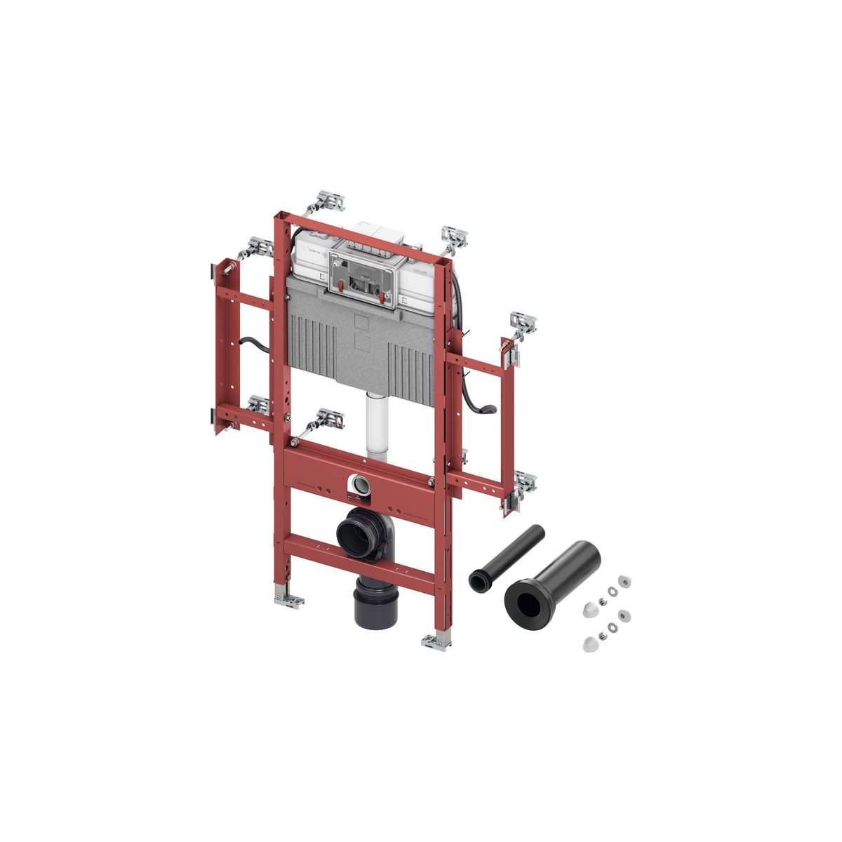 WC-Modul mit „easy fit”-Spültasten. Zur Befestigung an TECEprofil-Profilen oder in Unterputz-Profilwänden oder vor einer Mauerwand. Für barrierefreies Bauen mit erhöhter Befestigung der Keramik. Modul mit seitlichen Stahlrahmen und Isolierrohren zur Verlegung des Kabels, mit Montagematerialien.