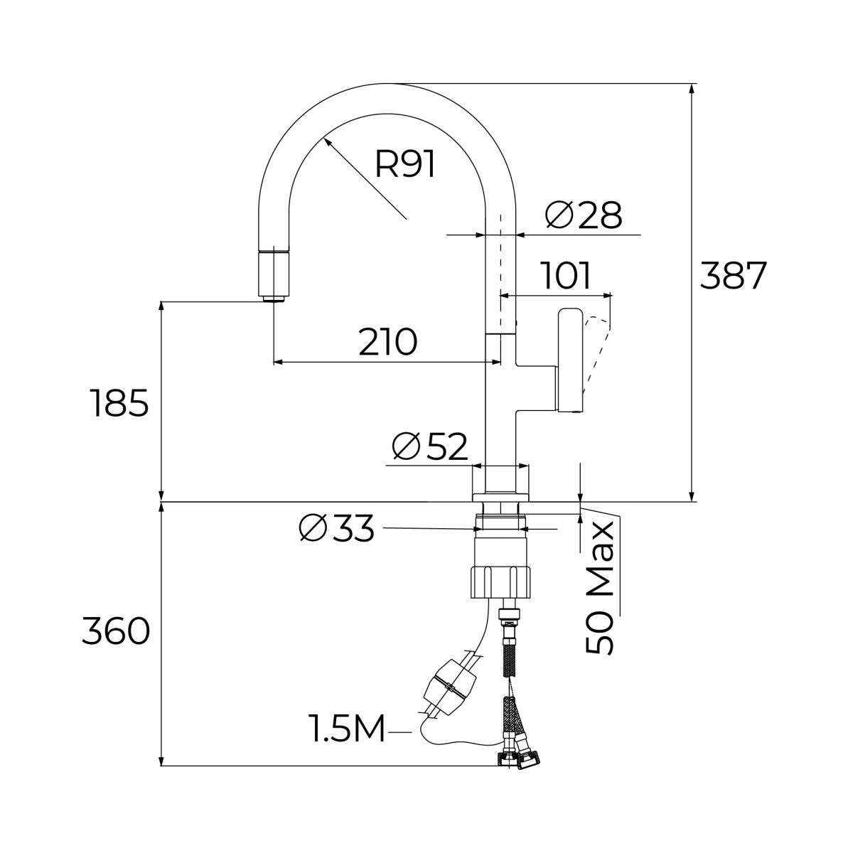 - Ausziehbarer Auslauf mit 2 Funktionen: Normal und Brause