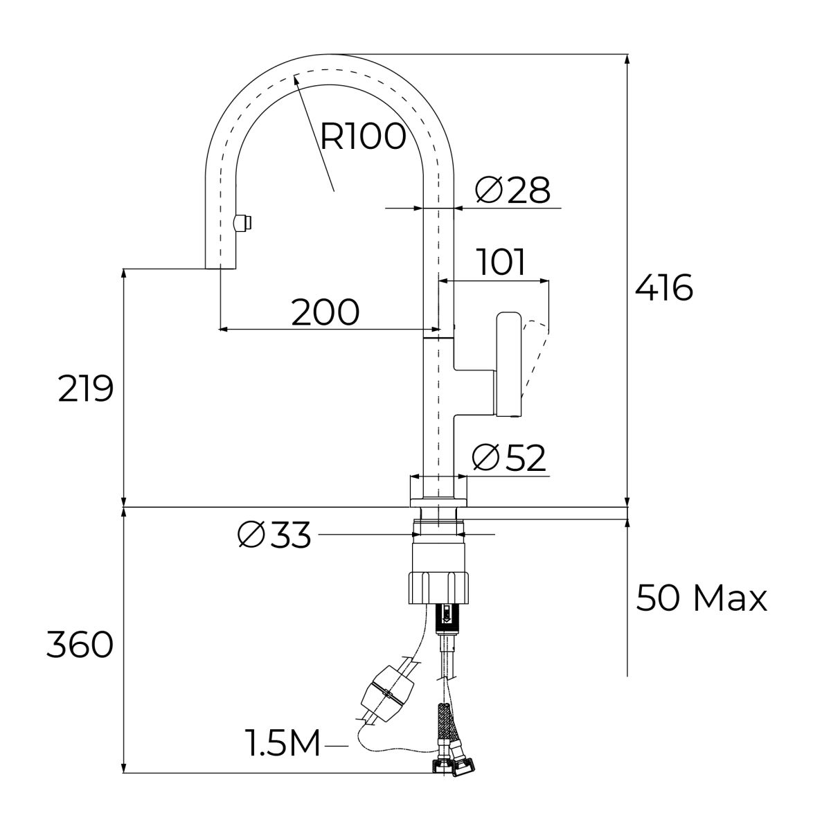 - Ausziehbarer Auslauf mit 2 Funktionen: Normal und Brause