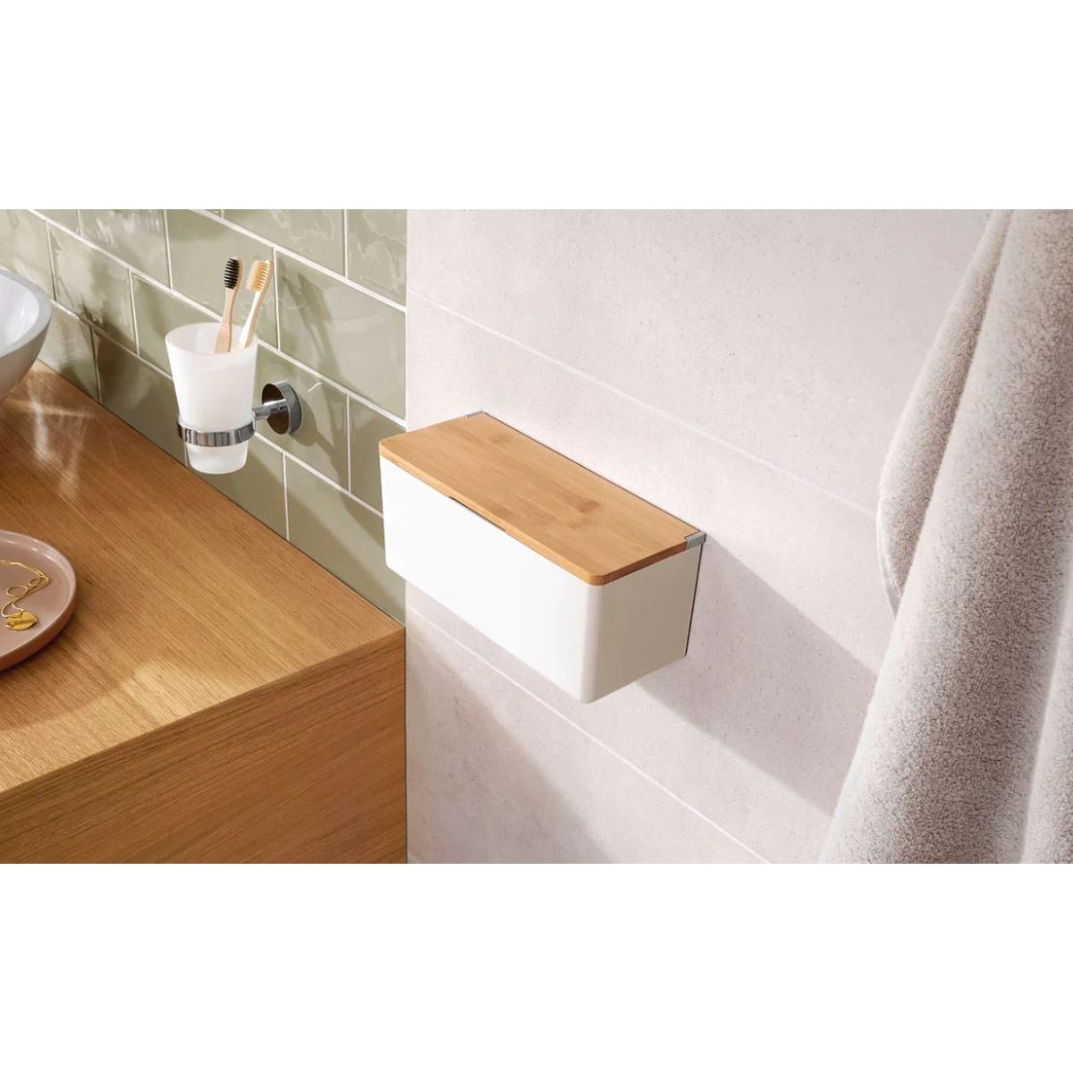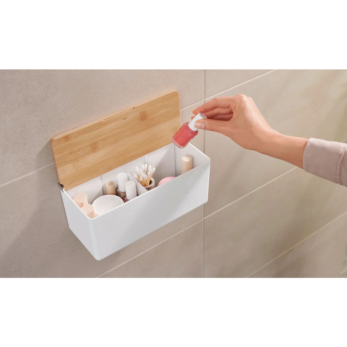 - Aufbewahrungsbox, die mit wasserfesten tesa® Powerstrips Waterproof Befestigungsstreifen befestigt wird (selbstklebende Befestigungslösung, die keine